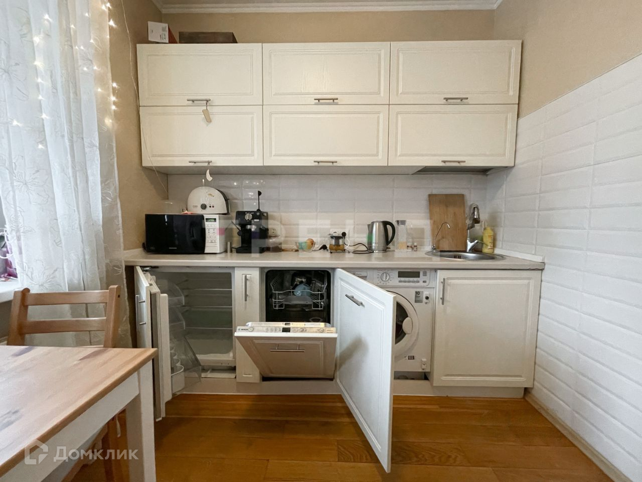 В квартире остается: встроенный кухонный гарнитур с техникой Воsh: холодильник, посудомоечная машина, стиральная машина, варочная панель, вытяжка.
