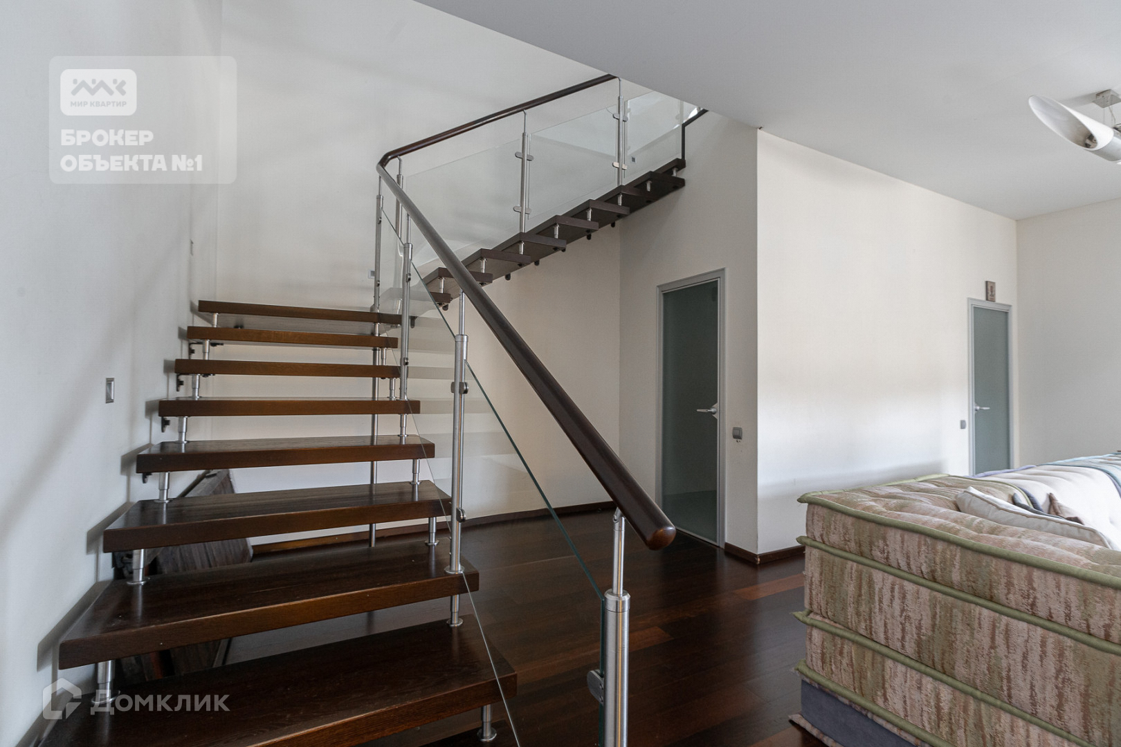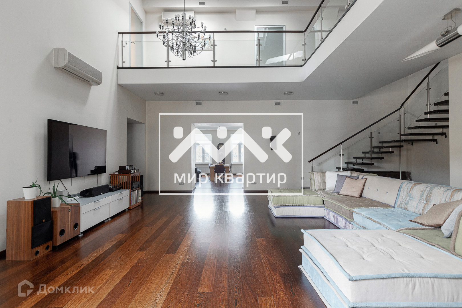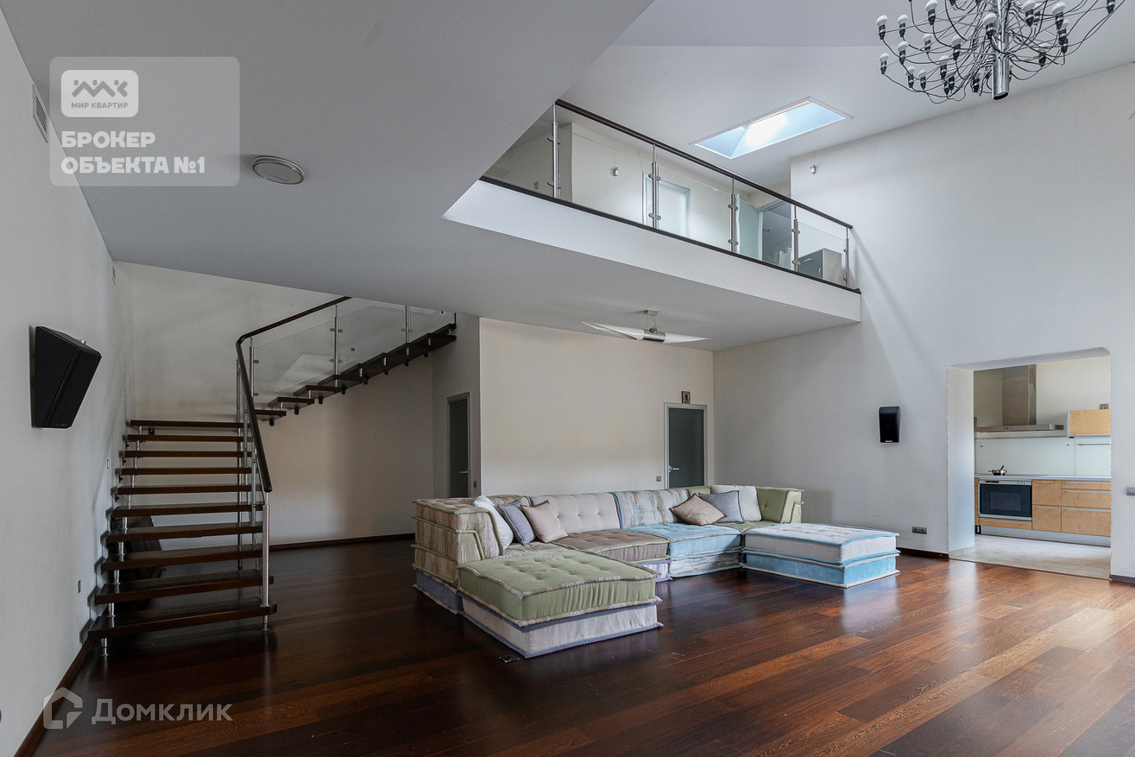 на 1 уровне большая гостиная с высоком потолком более 6 метров- создает бесконечное пространство, выход на кухню и в столовую зону, красивая лестница ведет на 2 уровень, отдельная комната под кабинет-библиотеку и еще 2 комнаты;