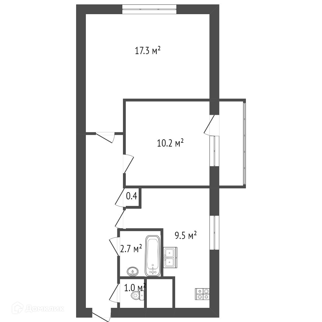 -2 комнаты (17,3 кв.м и 10,2 кв.м) и светлая кухня 9,5 кв.м