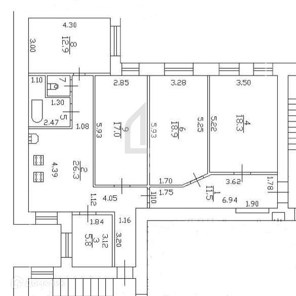Метраж комнат: 18.3, 18.9, 17, 12.9, 5.8.