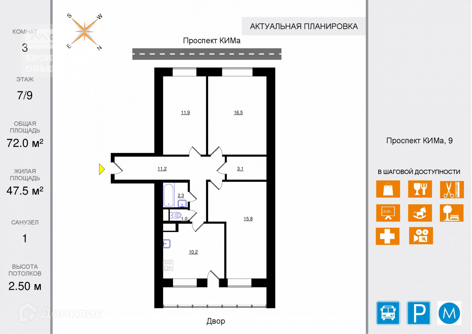 3-комнатная квартира, 72 м2, этаж 7 / 9, на продажу в Санкт-Петербурге, проспект КИМа, 9
