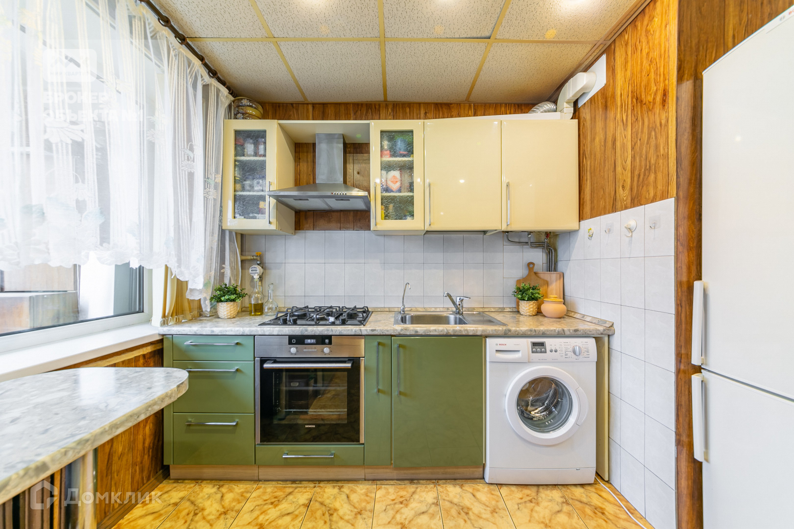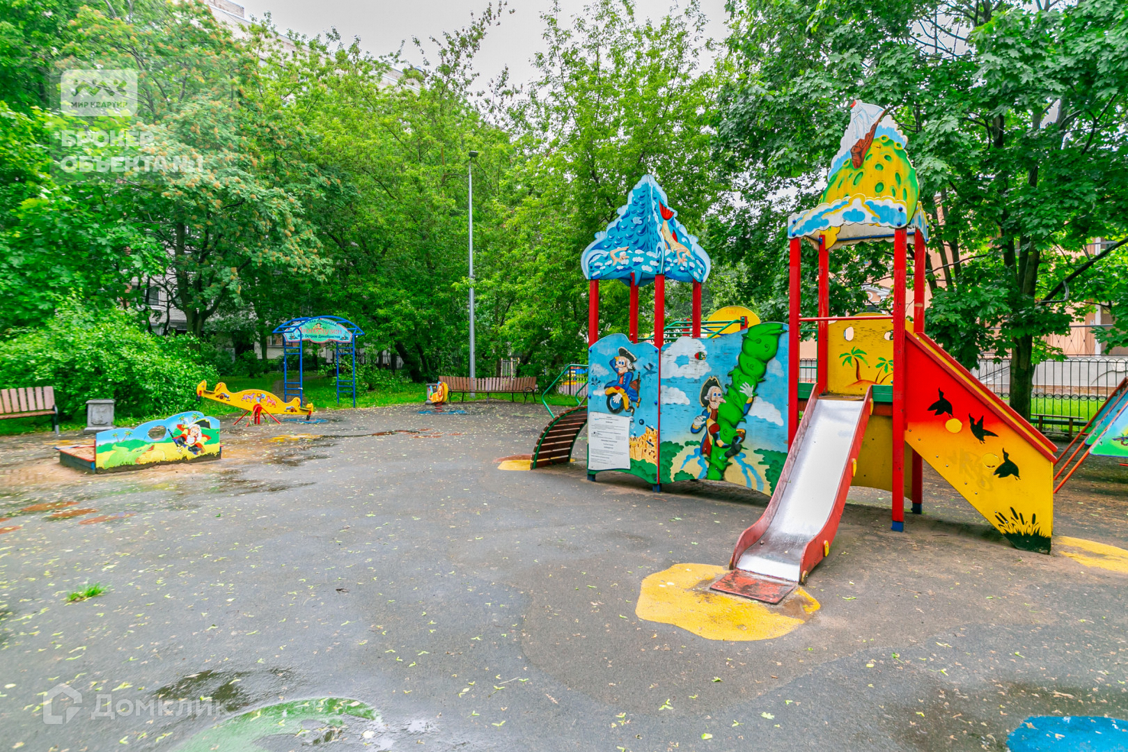 Окна выходят на площадь и в большой зеленый двор с детской площадкой.