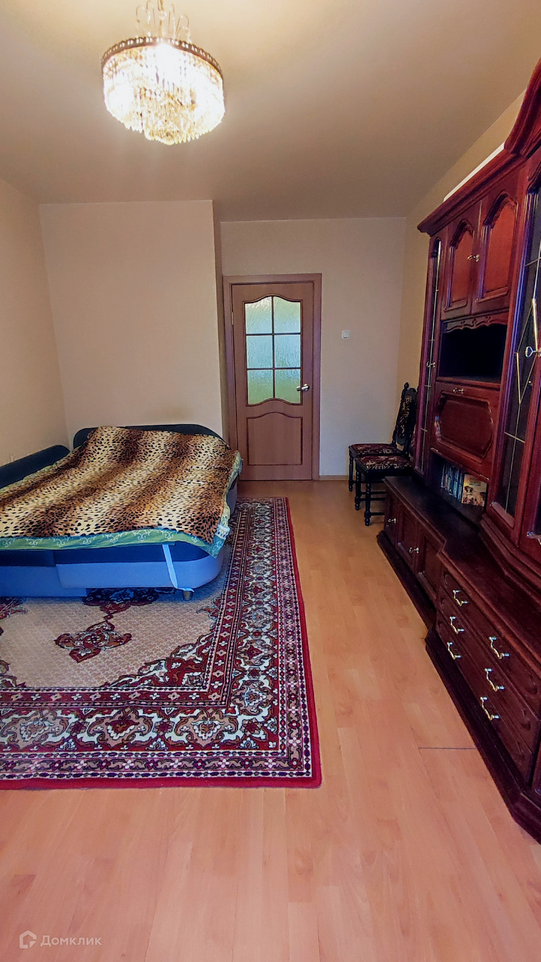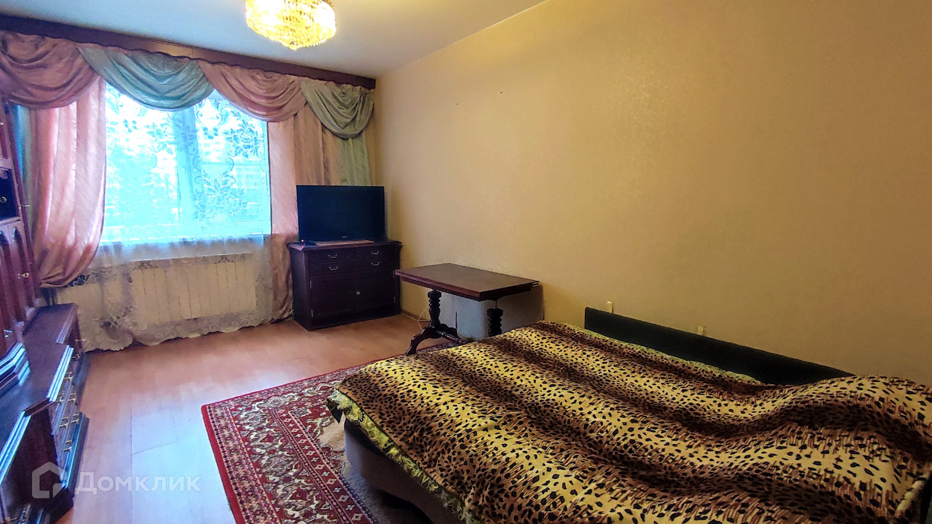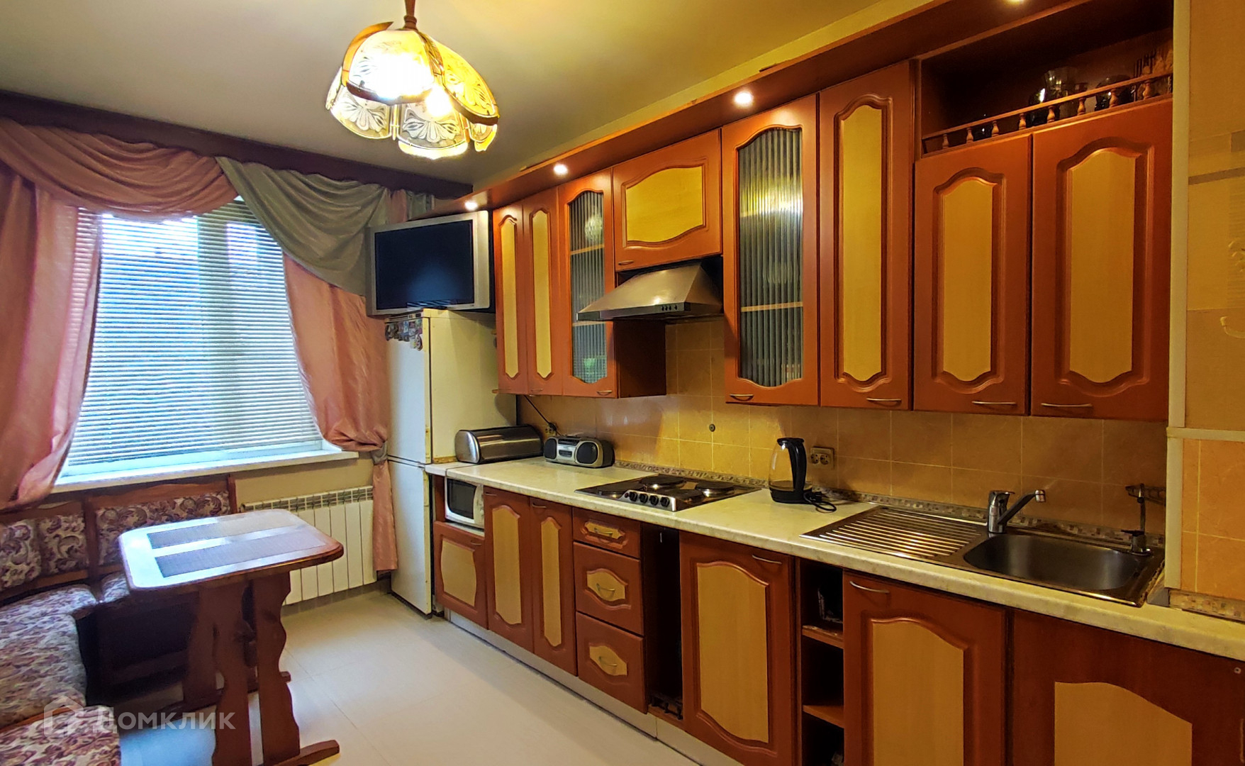Для новых хозяев остается встроенная кухня, мебель в комнате, встроенные шкафы-купе.