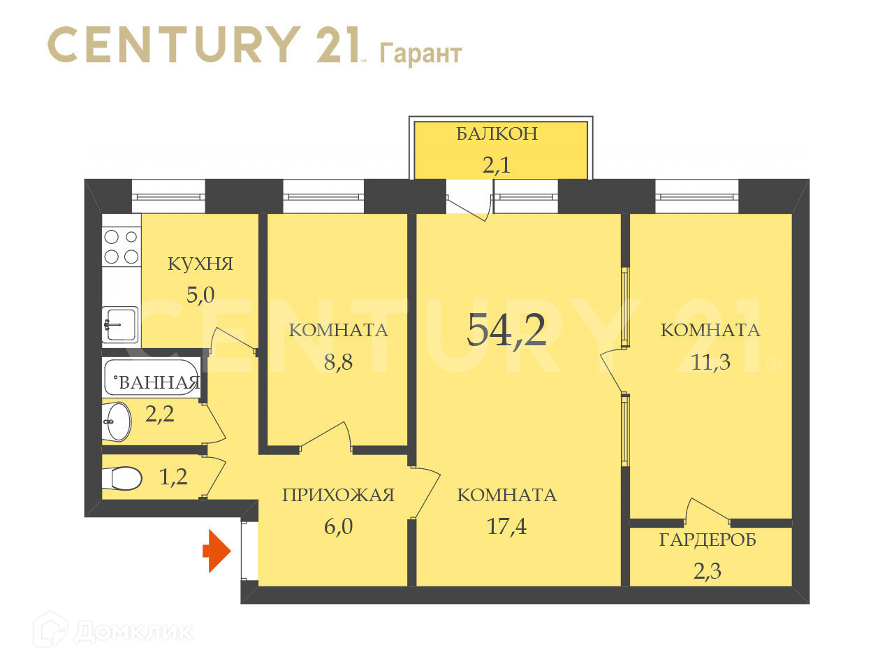 площадь комнат - 17,4 м2, 11,3 м2, 8,8 м2.