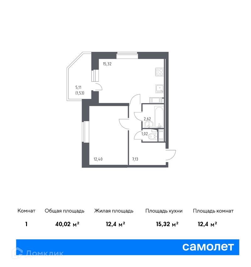 Общая площадь 40.02 м2