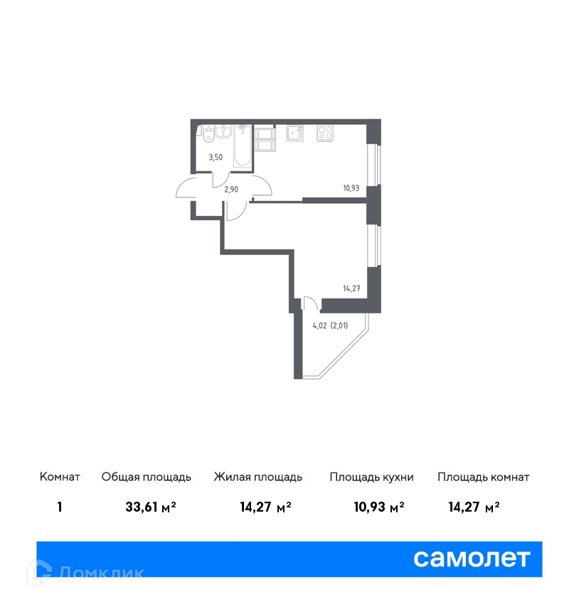 1-комнатная квартира, 33.61 м2, этаж 4 / 24, на продажу в Санкт-Петербурге, Славянская улица, 8