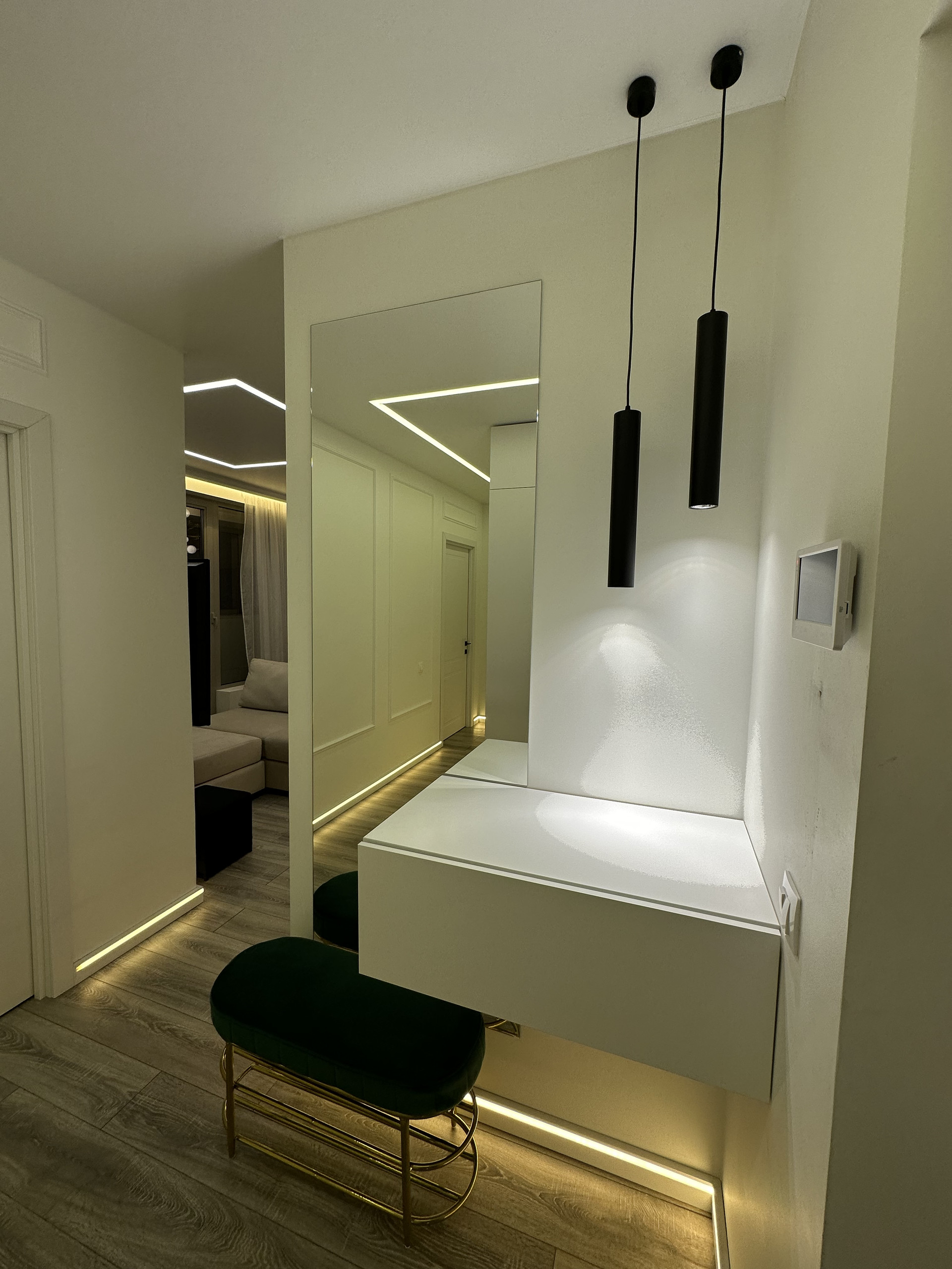 Прихожая площадью 3.28 кв.м. оборудована вместительным шкафом, большим зеркалом, подвесной тумбой, банкеткой и выкатным пуфом. Просторный коридор с вместительной гардеробной площадью 2.3 кв.м., в которой размещены штанга и стеллажи для хранения одежды/предметов/мелочей.