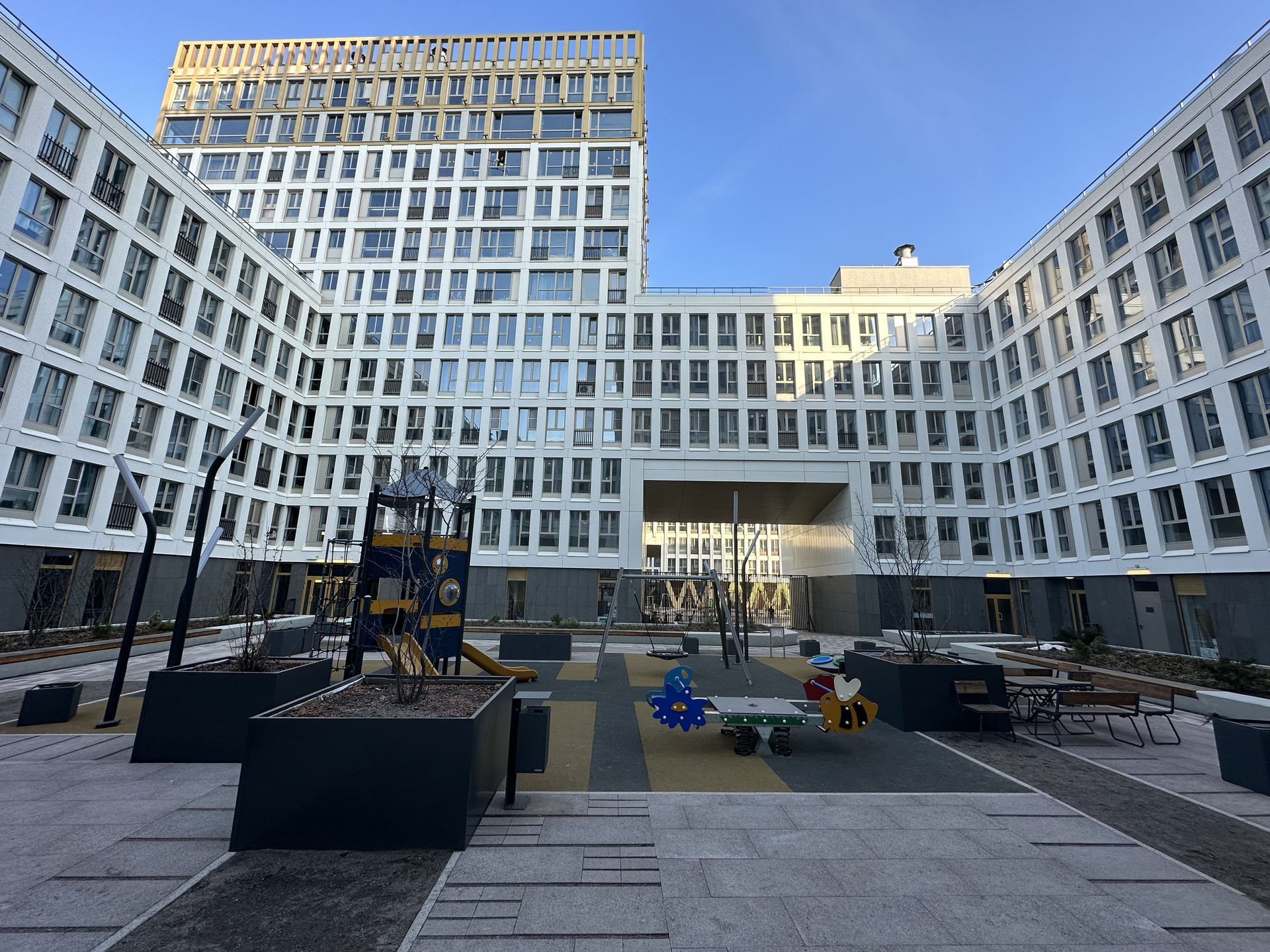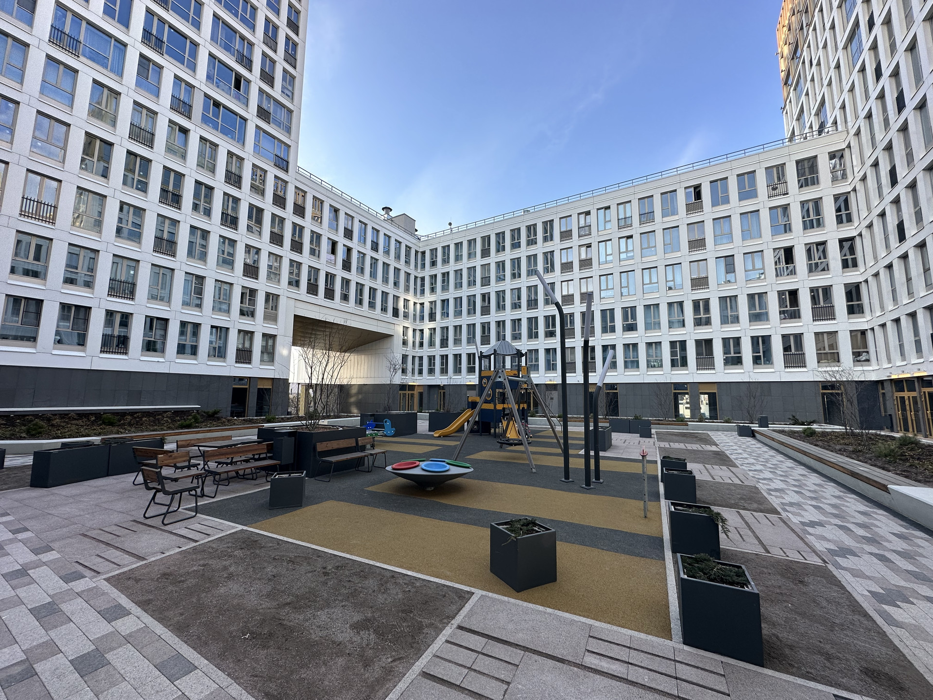 Закрытый двор от машин, современная детская площадка, система видеонаблюдения, единая диспетчерская служба, подземный паркинг с видеонаблюдением, в котором можно снять в аренду парковочное место. Лифт спасается прямо в паркинг.