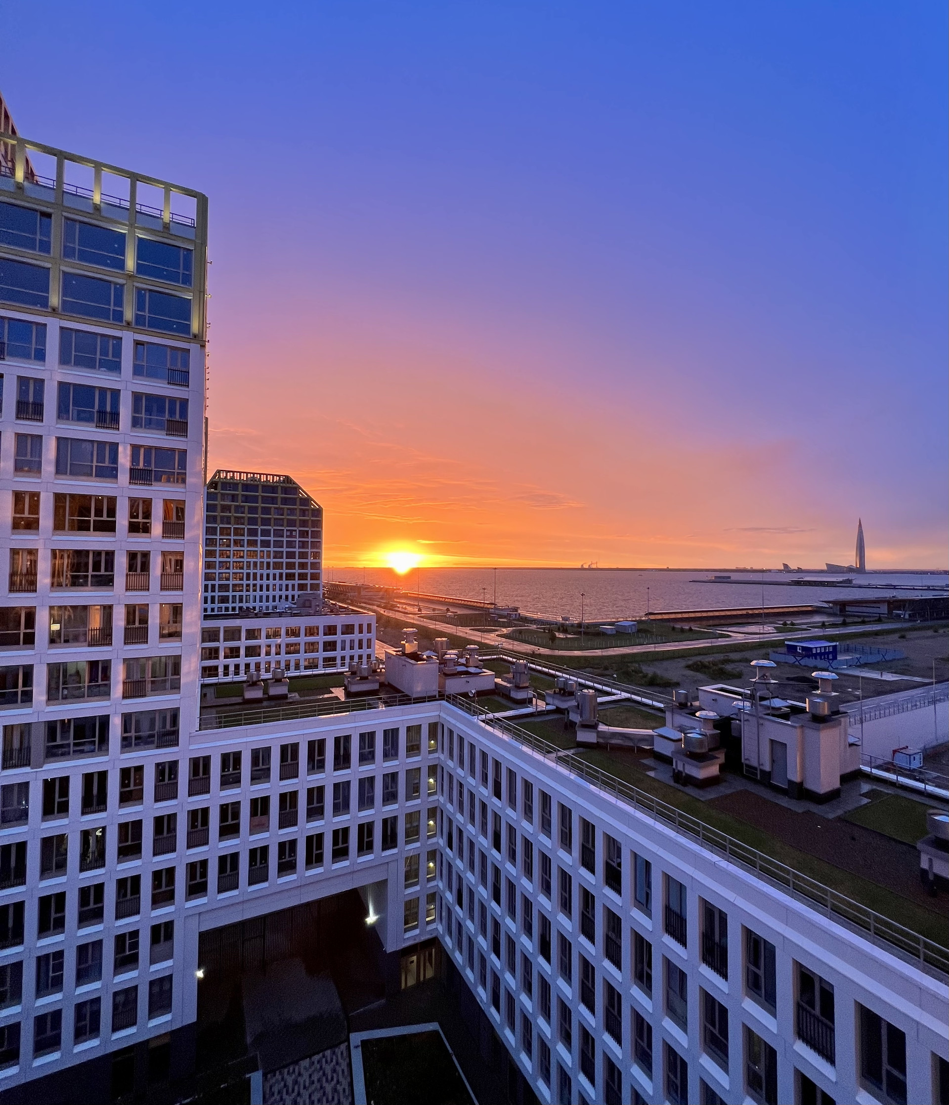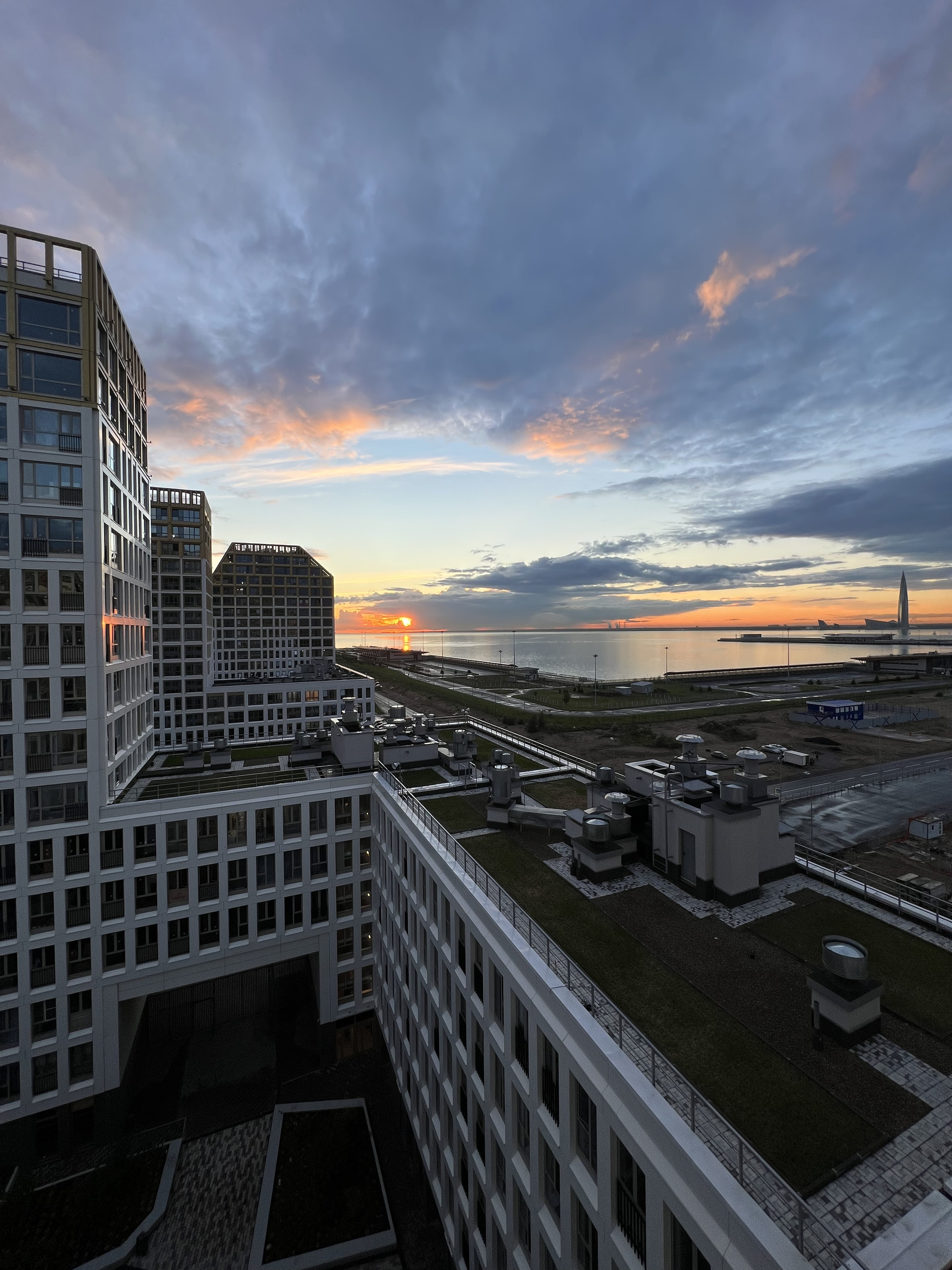 Все окна квартиры панорамные с расширенными проемами, выходят на одну сторону, откуда открывается потрясающий вид на Финский залив, Лахта-центр и Морской вокзал.