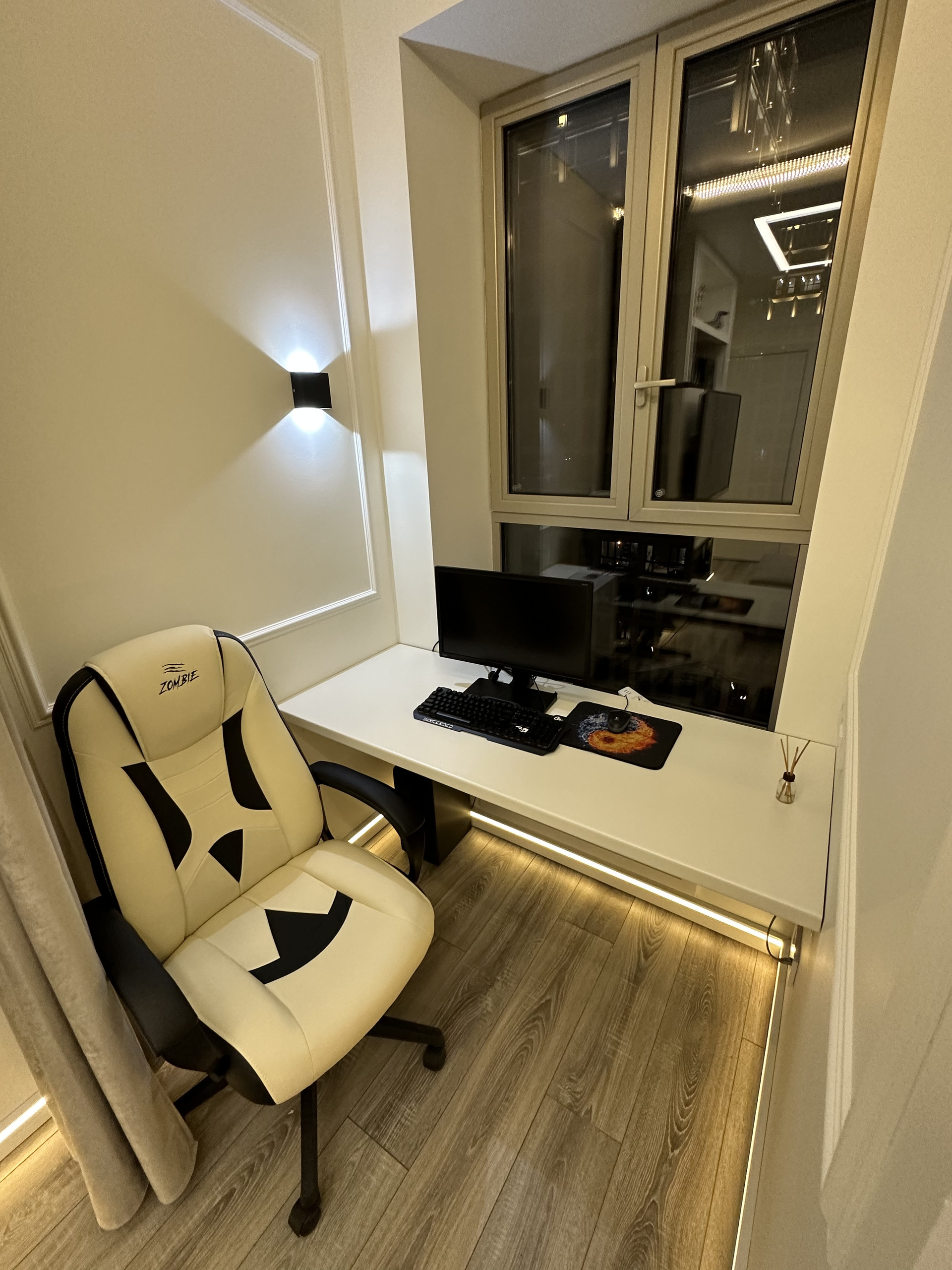 рабочая зона у окна со столешницей и компьютерным стулом.