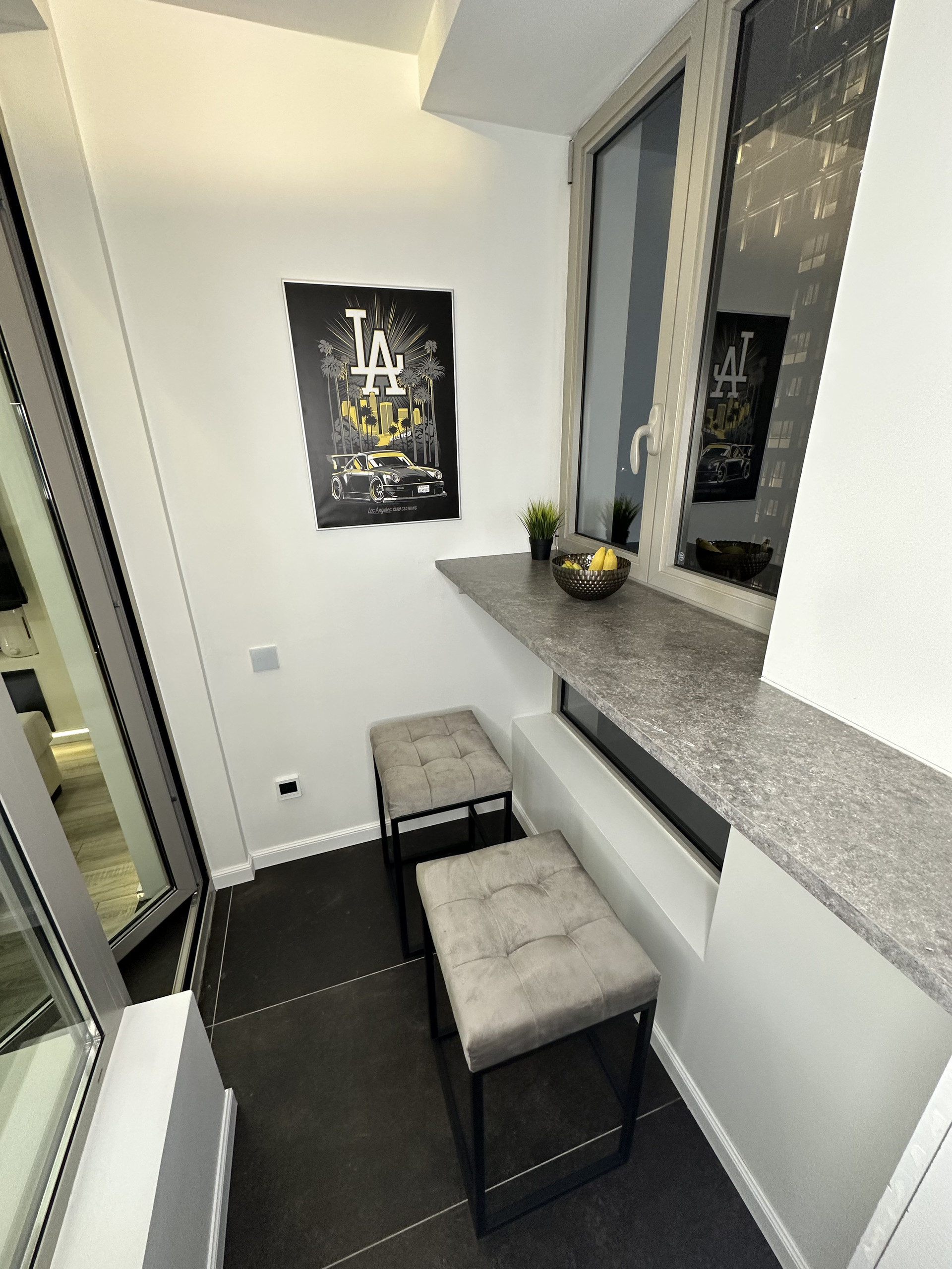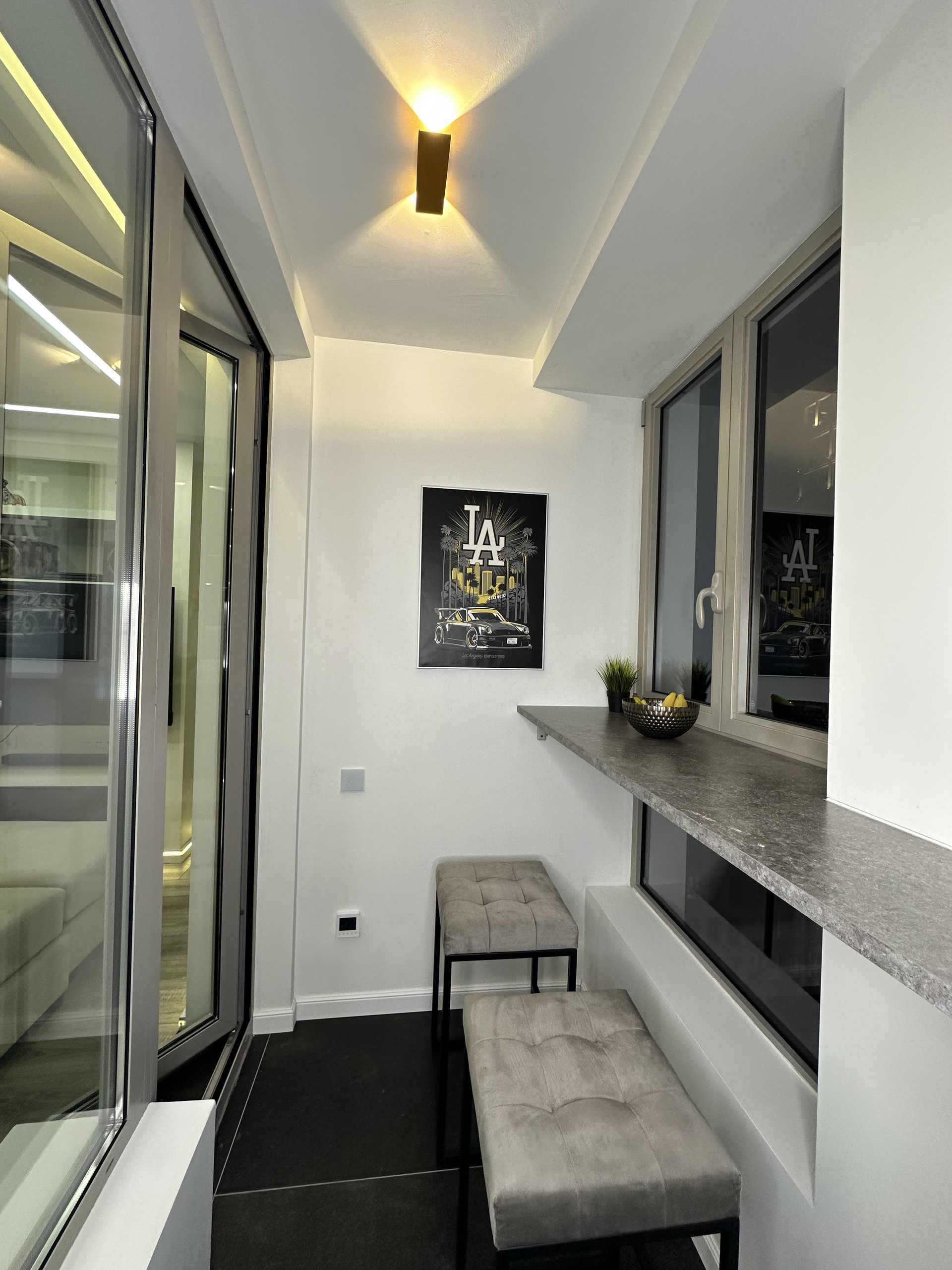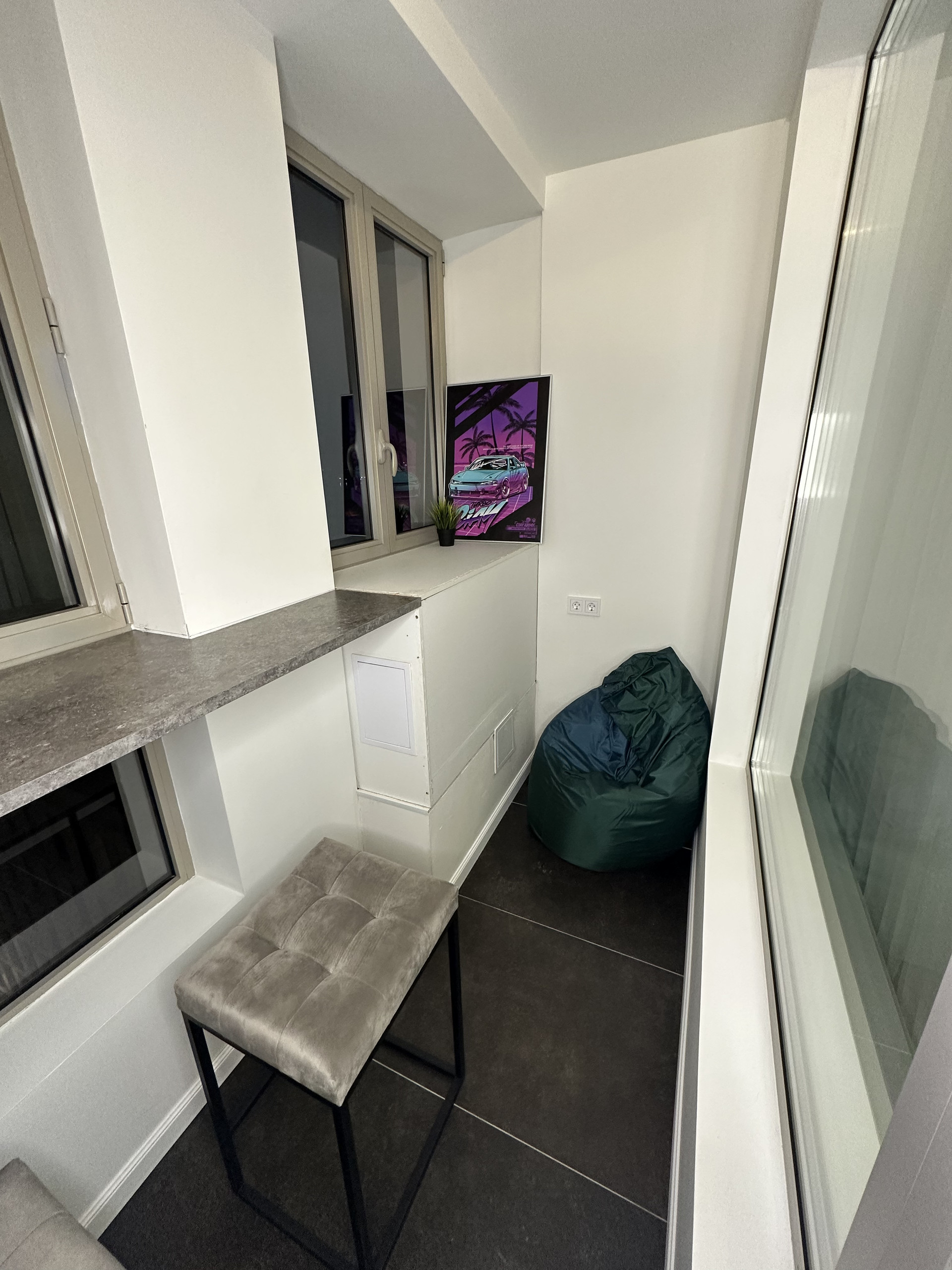 Застекленная видовая лоджия площадью 3,6 кв.м., с барной стойкой и пуфом для отдыха. Можно использовать кухонные барные стулья и наслаждаться волшебными закатами и заливом.