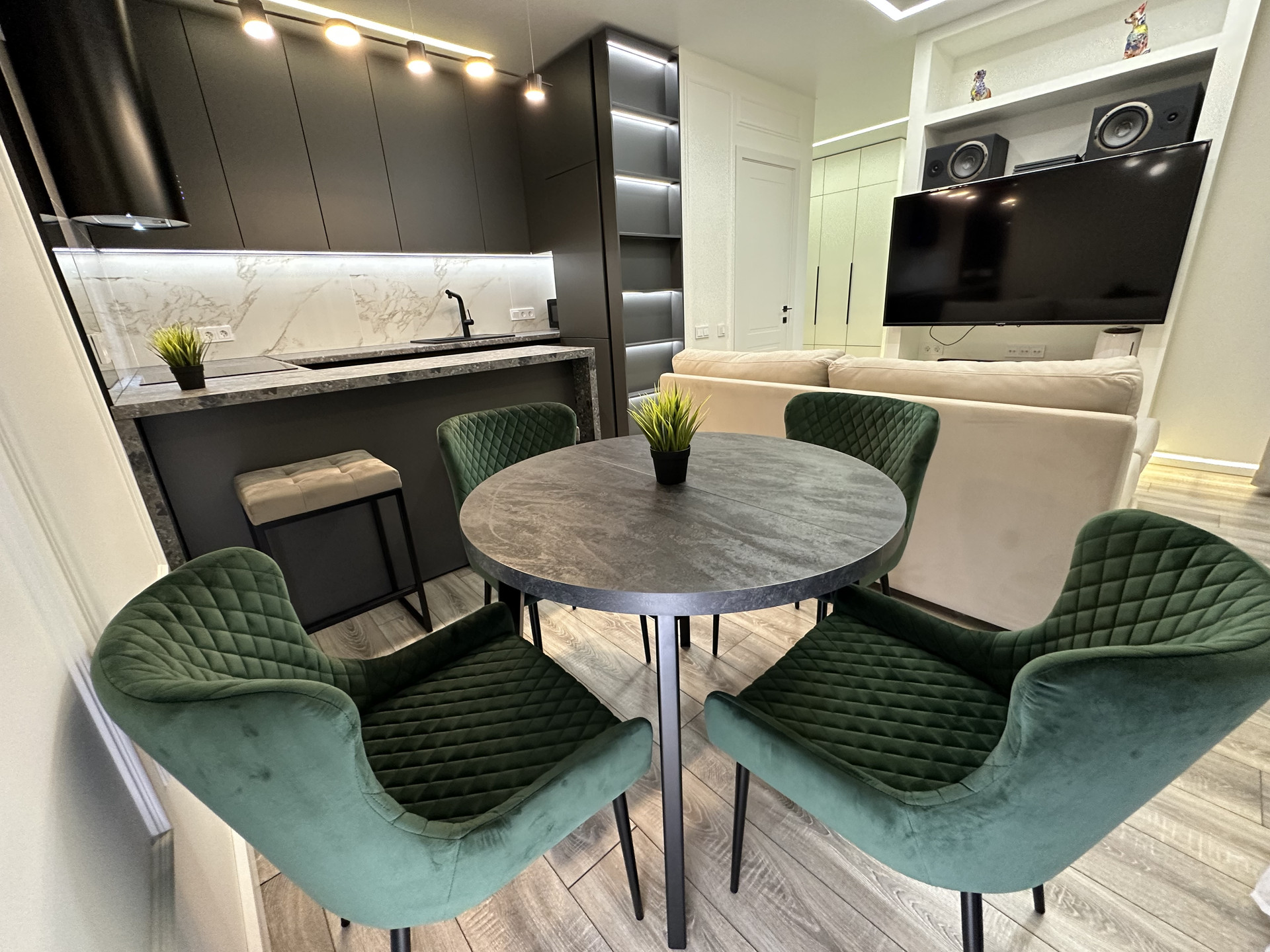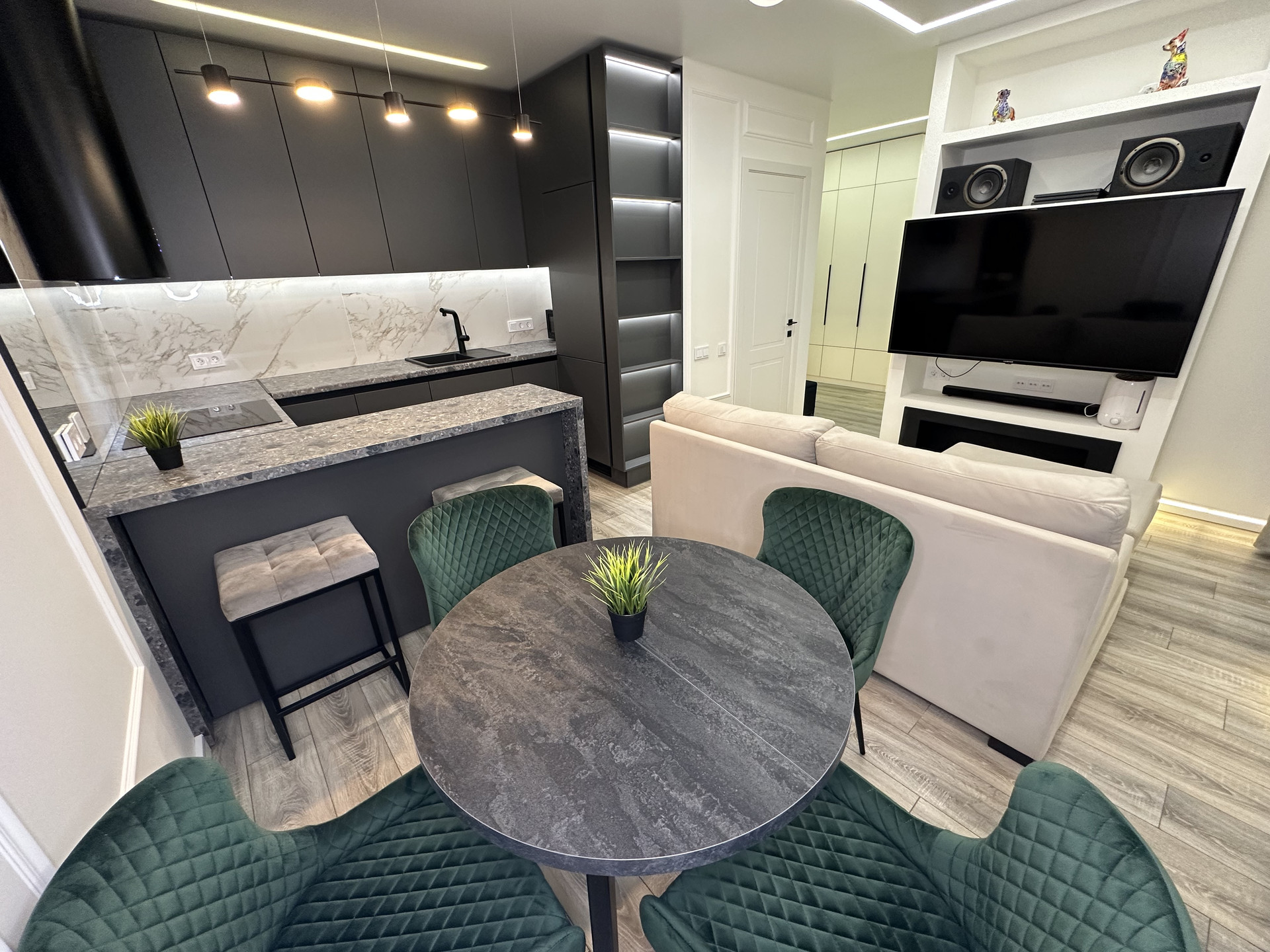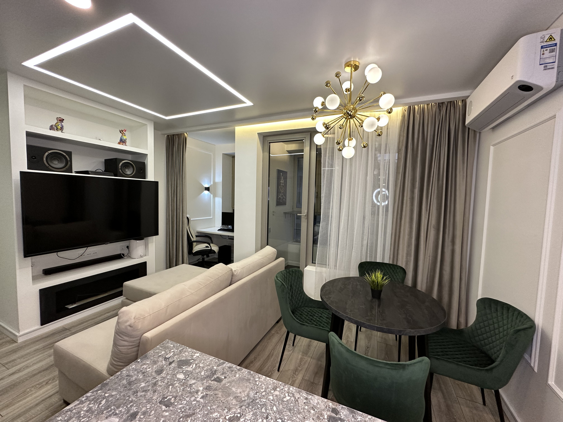 Просторная кухня-гостиная площадью 26,8 кв.м. с выходом на балкон, разделена на 4 зоны: зона приготовления пищи с барной стойкой и двумя стульями, встроенной бытовой техникой (холодильник, посудомоечная машина, духовой шкаф); обеденная зона с раскладным круглым столом и 4 стульями; зона отдыха с раскладным диваном, большим телевизором и камином; рабочая зона у окна со столешницей и компьютерным стулом.