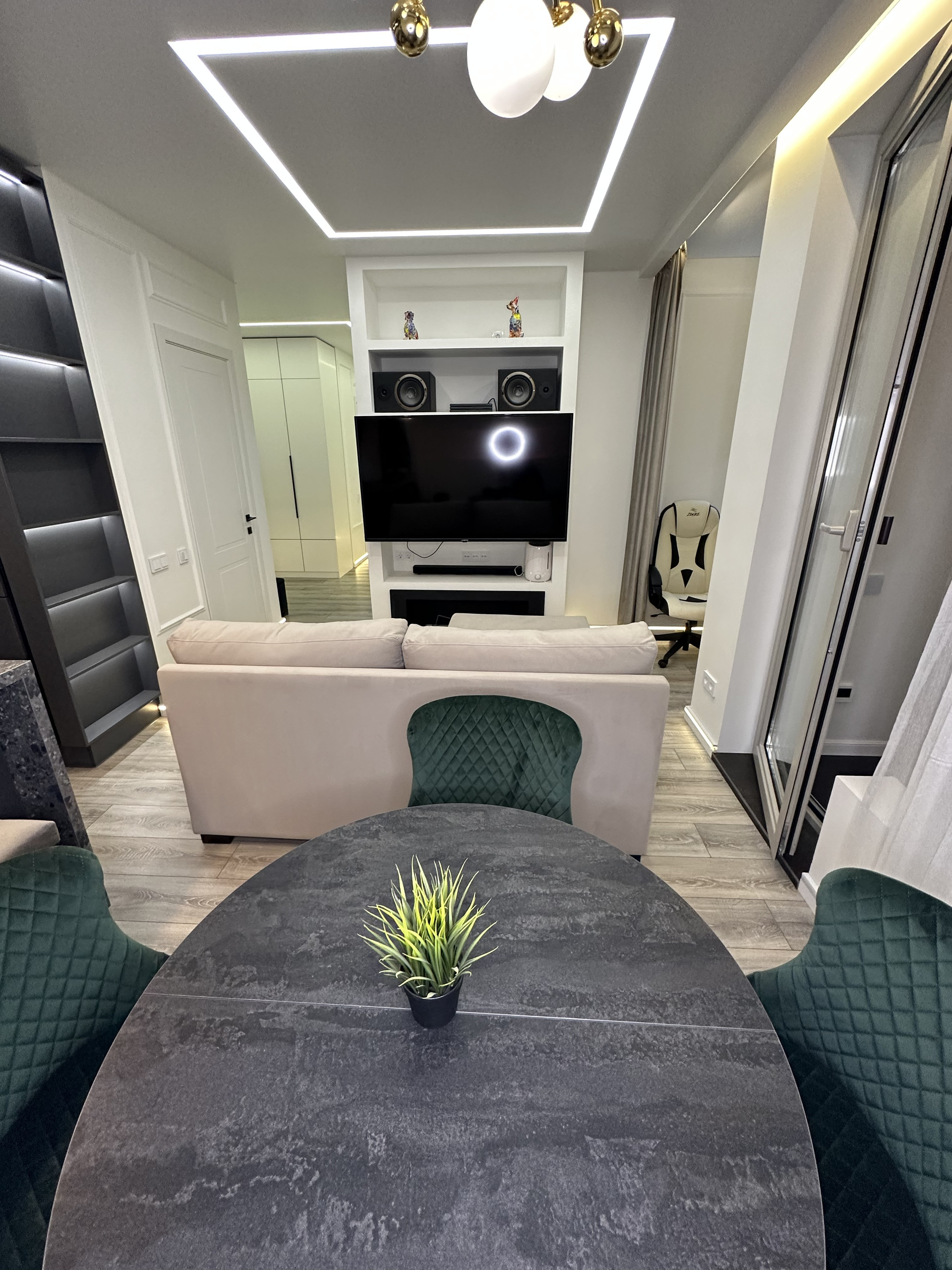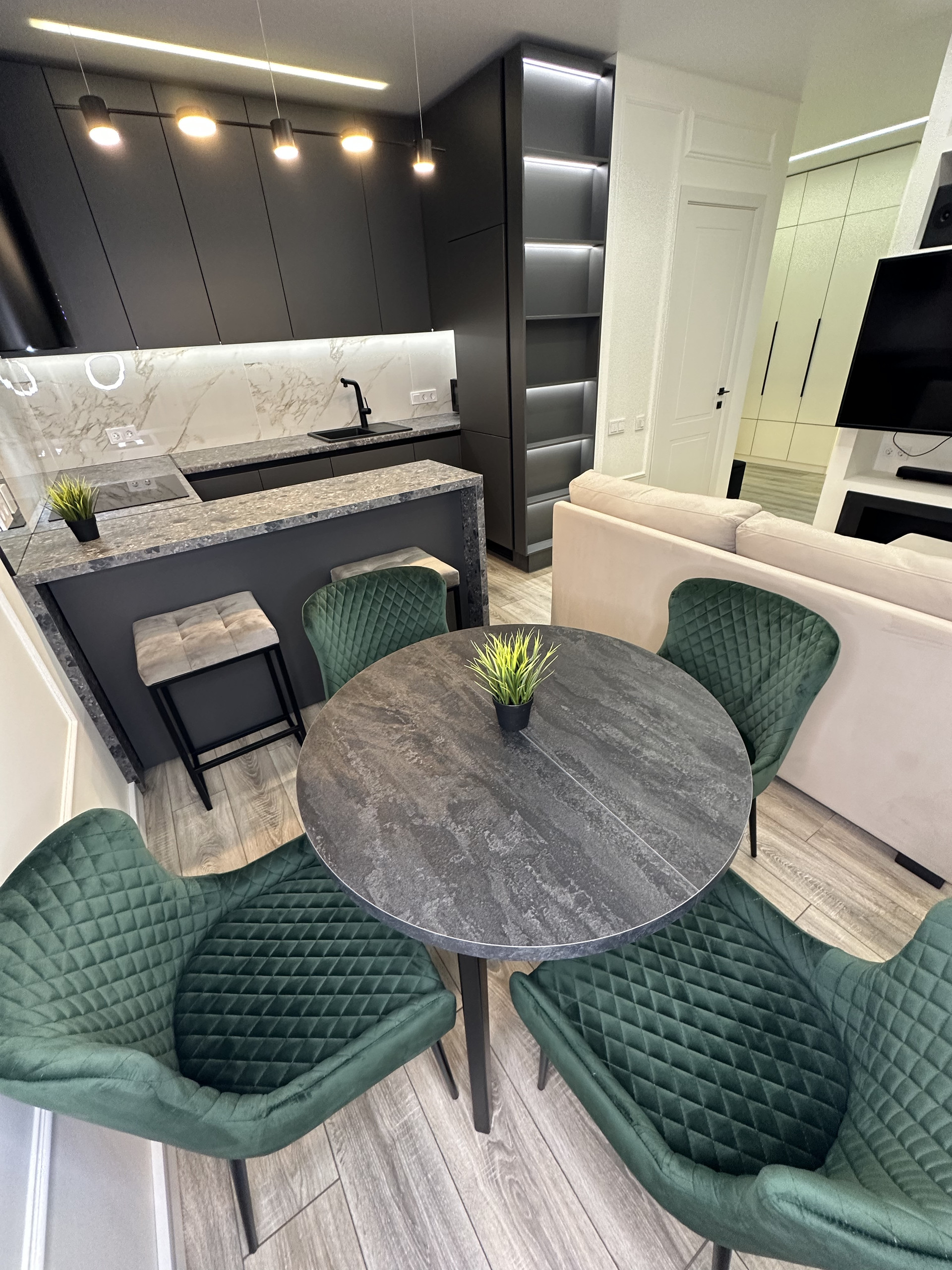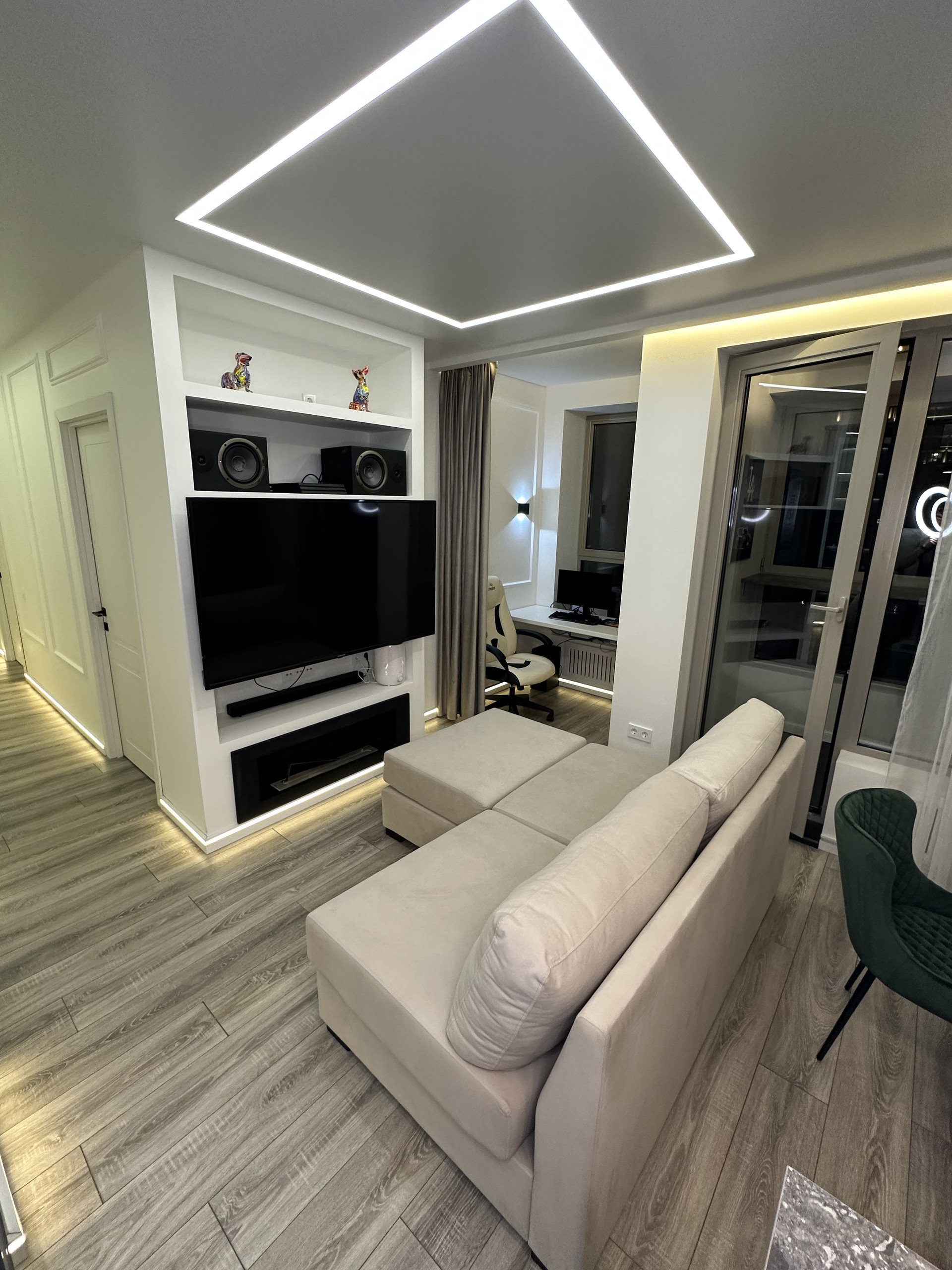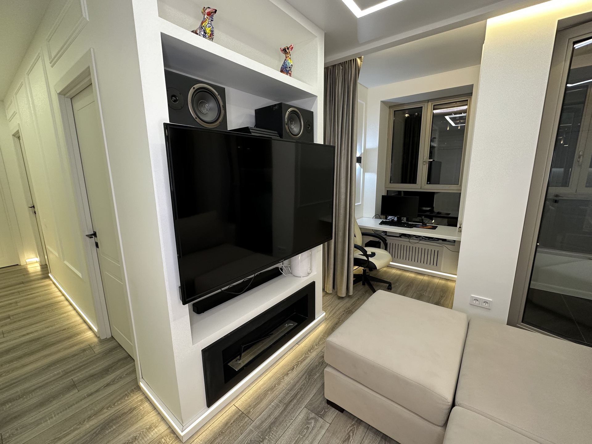 Просторная кухня-гостиная площадью 26,8 кв.м. с выходом на балкон, разделена на 4 зоны: зона приготовления пищи с барной стойкой и двумя стульями, встроенной бытовой техникой (холодильник, посудомоечная машина, духовой шкаф); обеденная зона с раскладным круглым столом и 4 стульями; зона отдыха с раскладным диваном, большим телевизором и камином; рабочая зона у окна со столешницей и компьютерным стулом.
