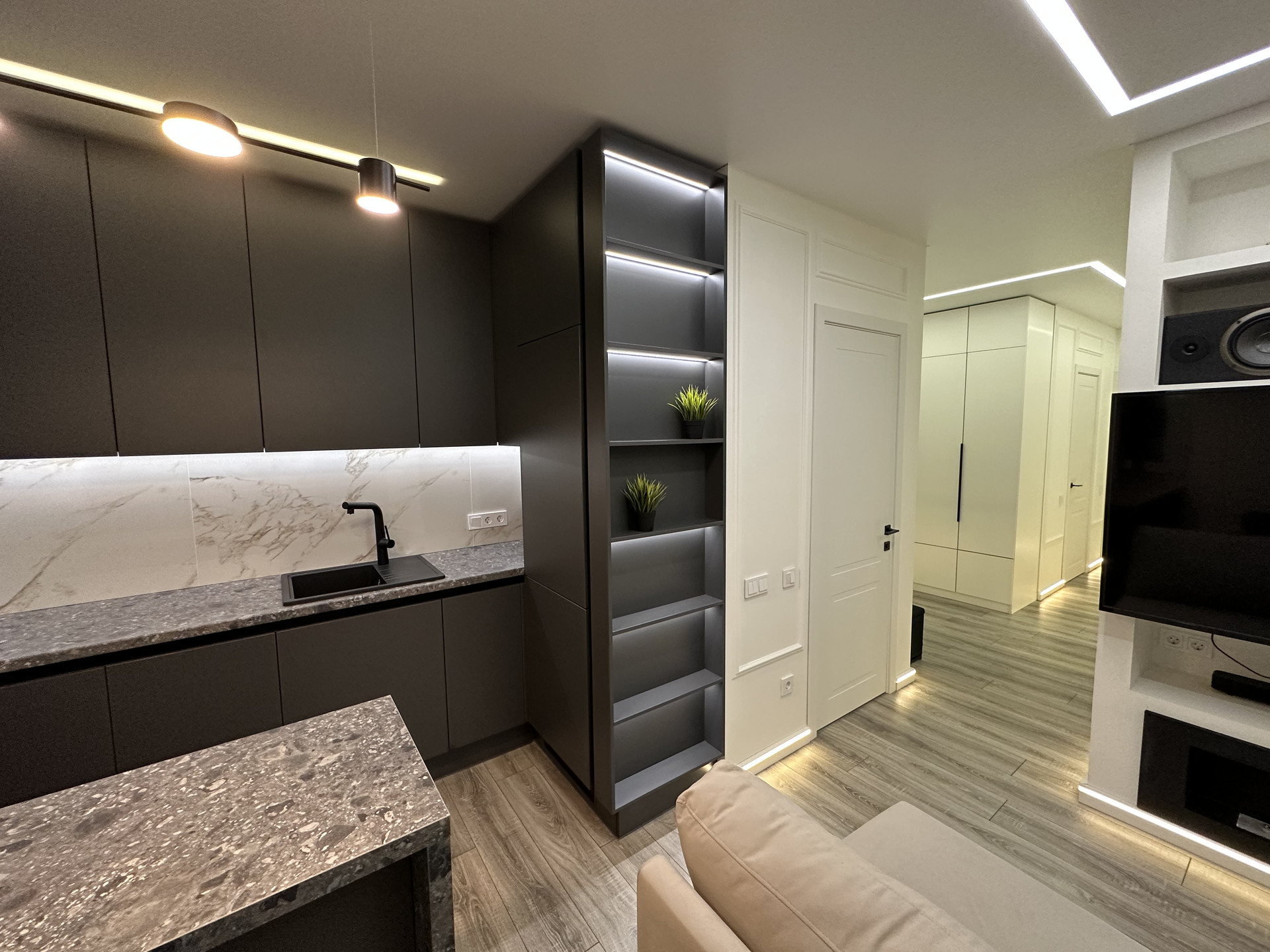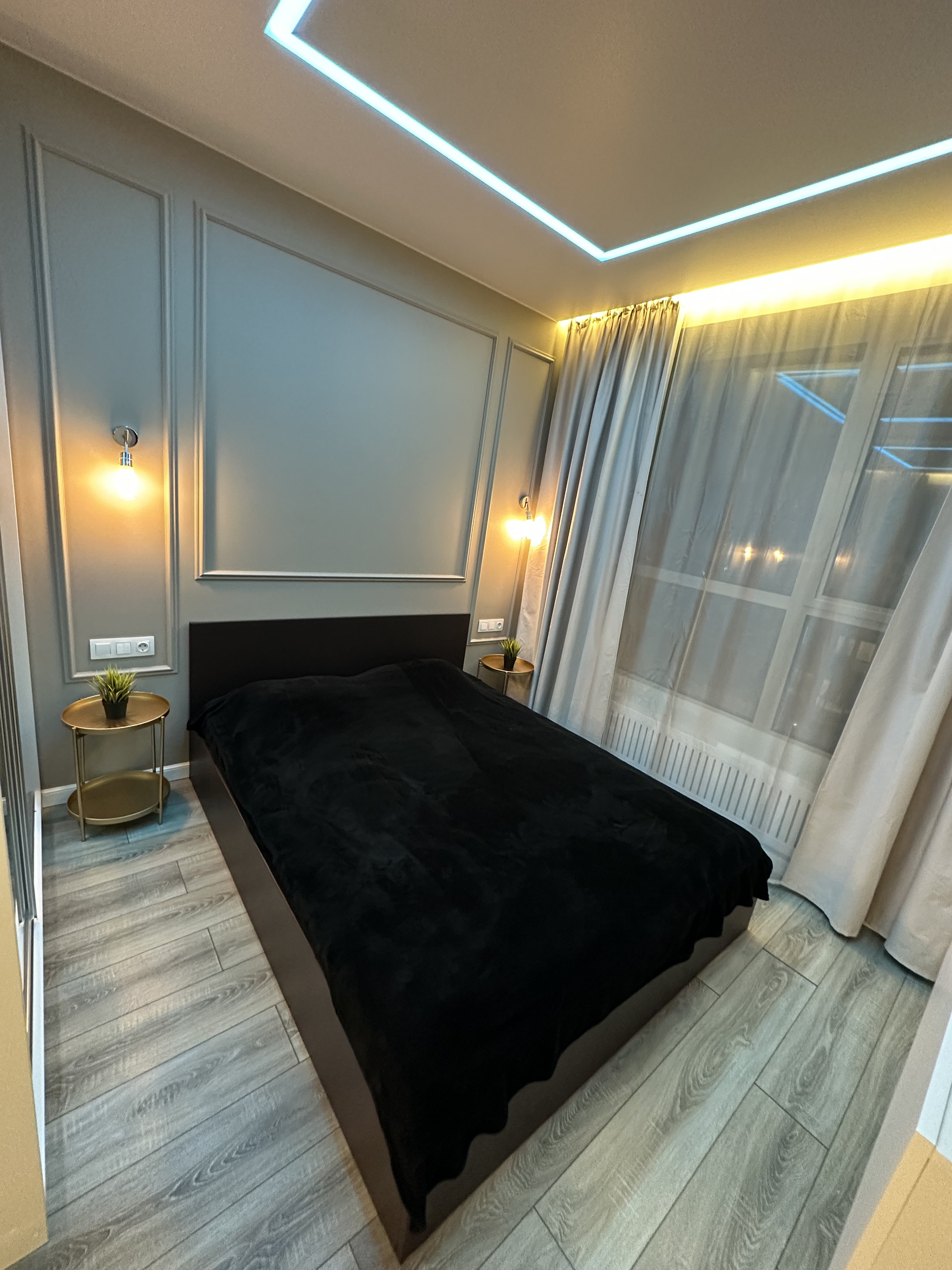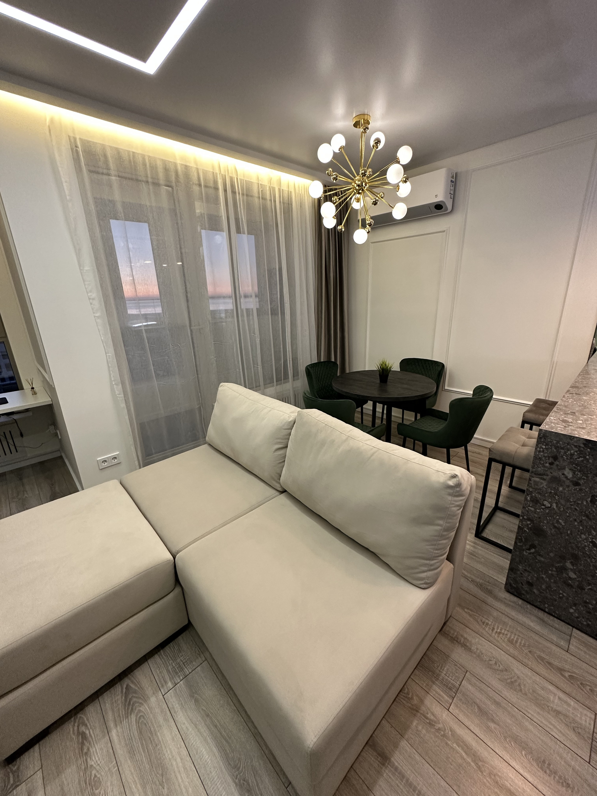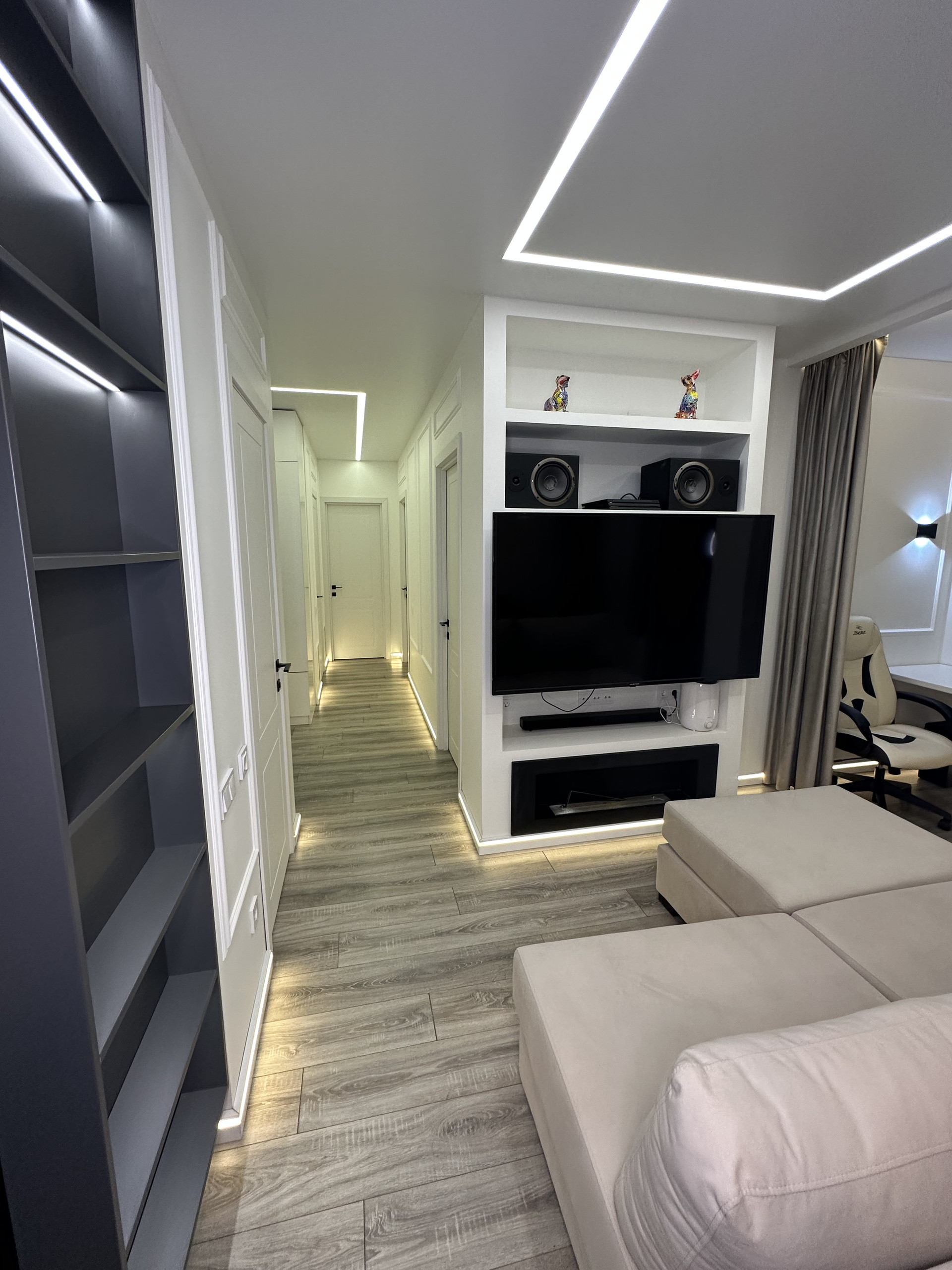 Межкомнатные двери с автозапорными замками; стены окрашенные с молдингами; напольное покрытие ламинат (кухня-гостиная, коридор, спальни) и плитка (санузлы, балкон). Различные сценарии освещения во всей квартире (потолочная подсветка, подсветка плинтусов, подсветка карнизов, регулируемая подсветка разных зон); большое количество розеток. В квартире очень тихо, соседей не слышно.