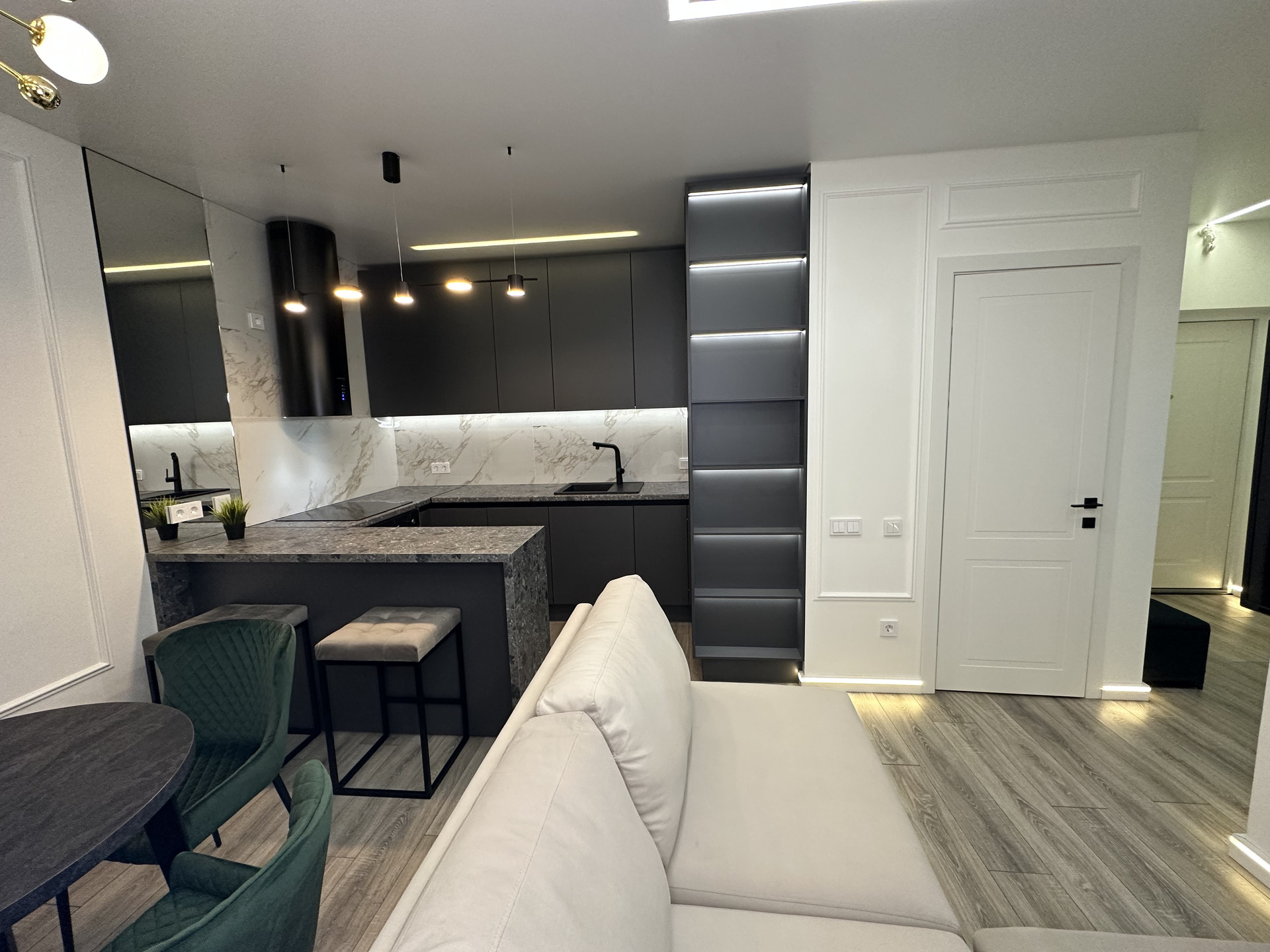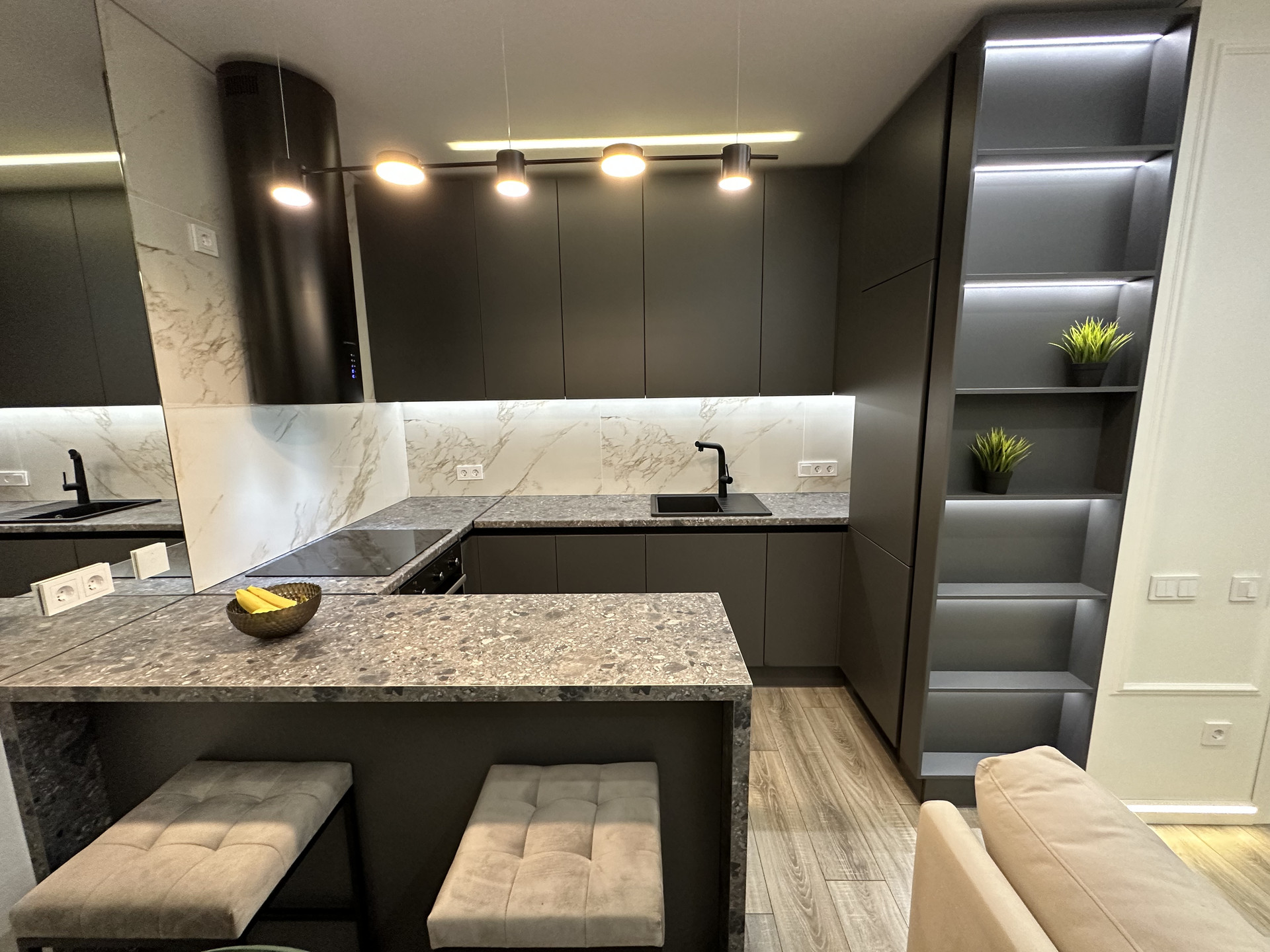 зона приготовления пищи с барной стойкой и двумя стульями, встроенной бытовой техникой (холодильник, посудомоечная машина, духовой шкаф);