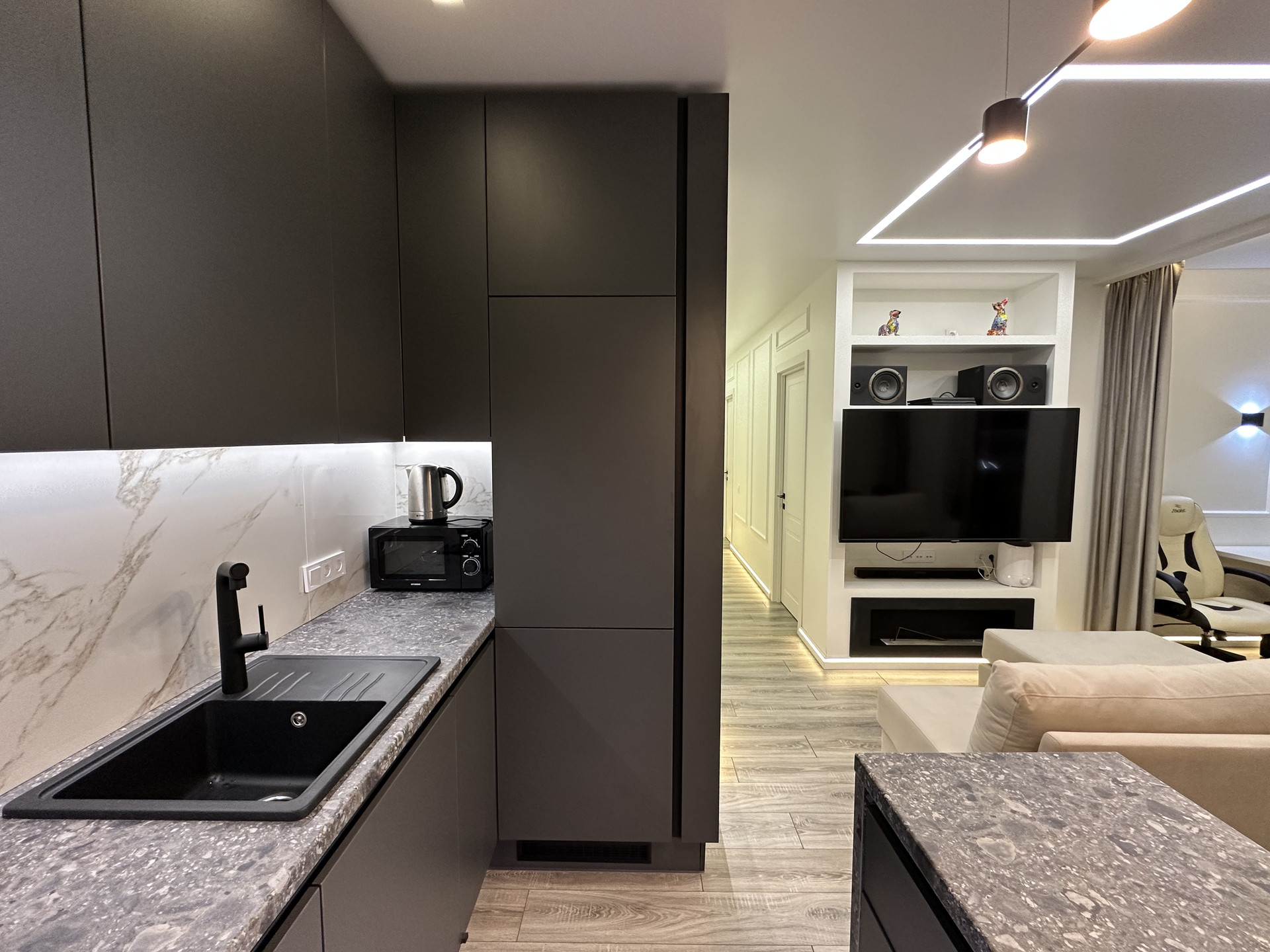 В зоне приготовления пищи установлены варочная панель BOSH с премиальной вытяжной цилиндрической системой MAUNFELD. Есть микроволновая печь, электрический чайник, мойка с установленным фильтром для очистки воды и автоматическим измельчителем отходов.
