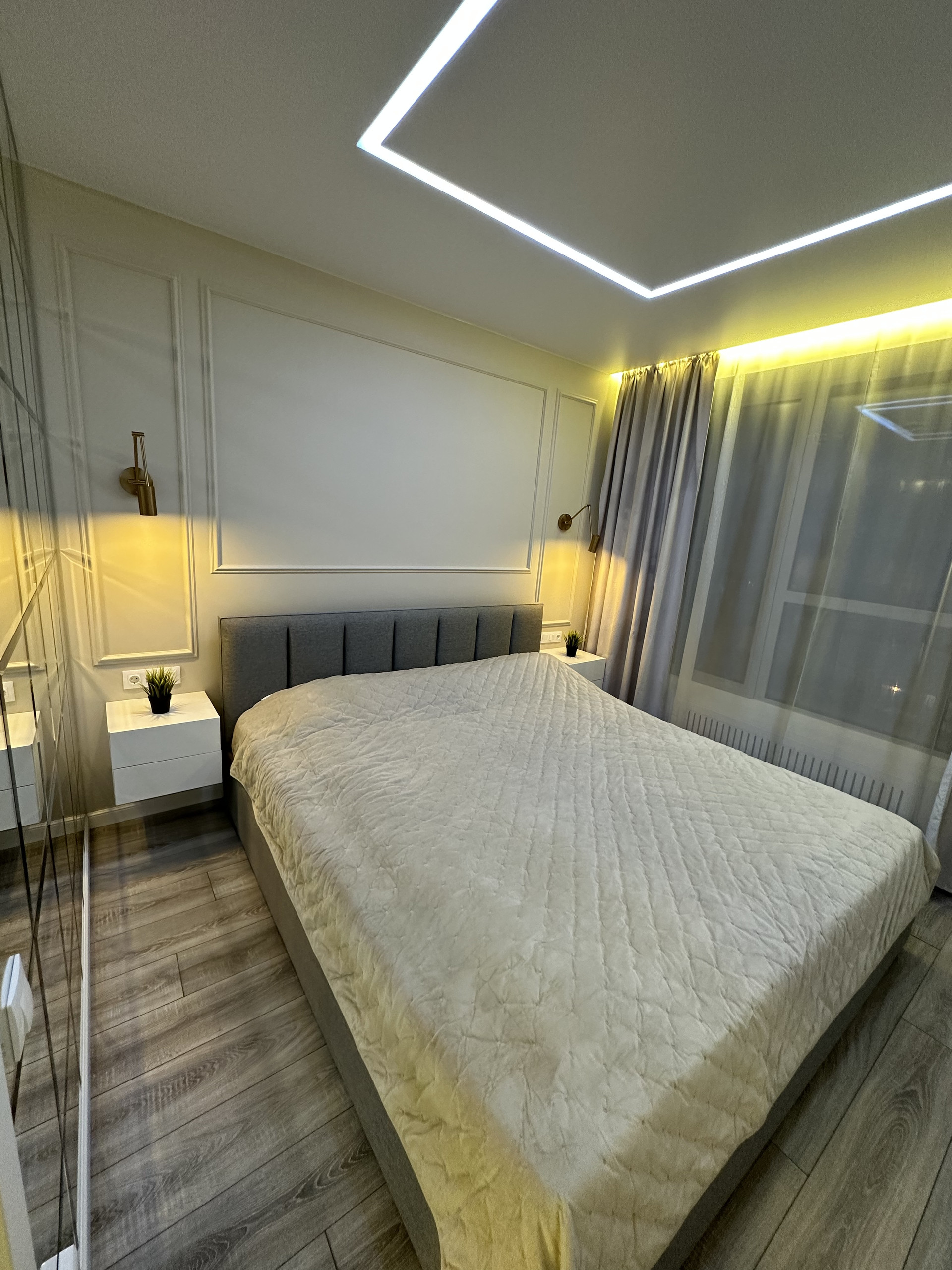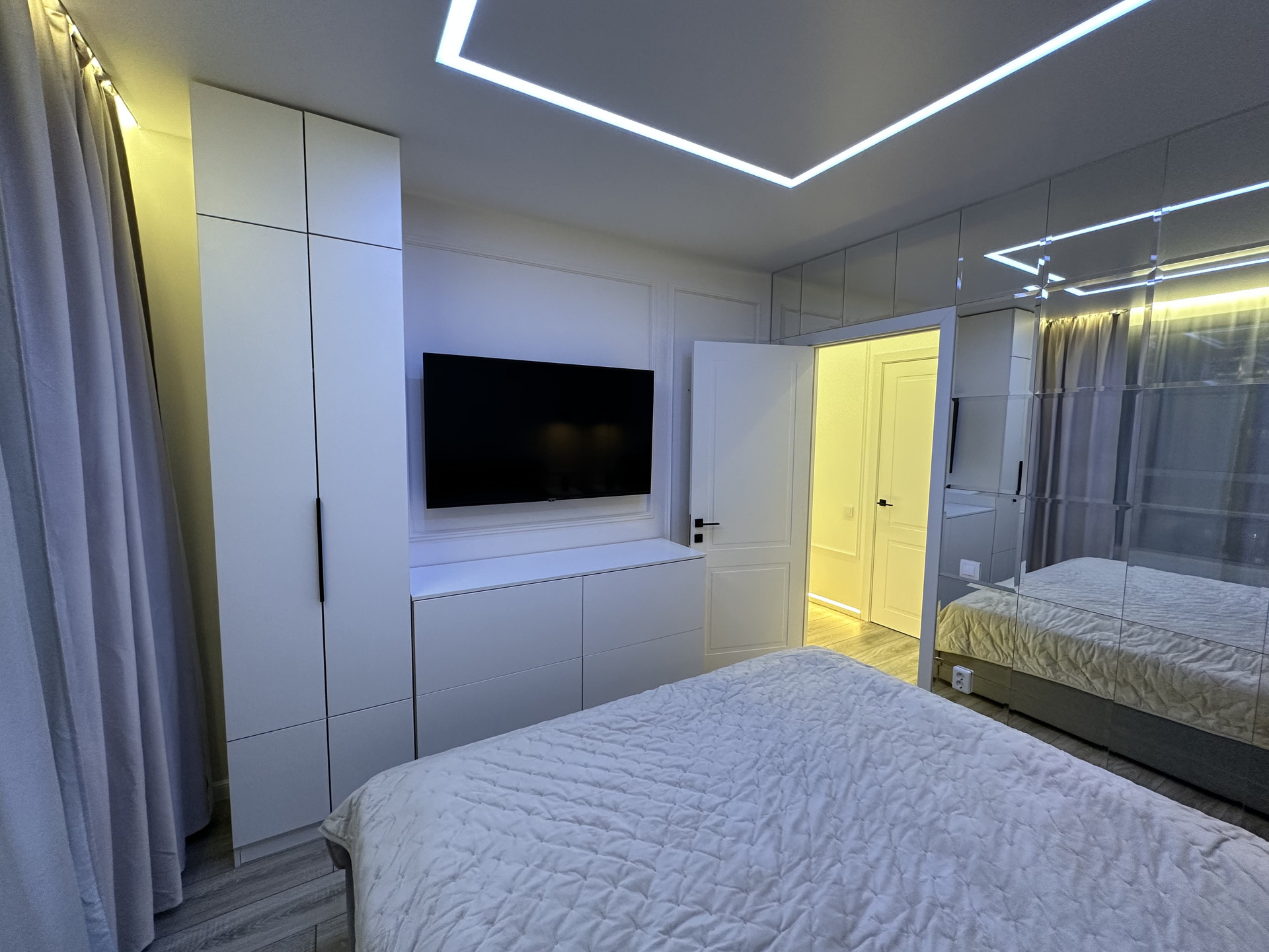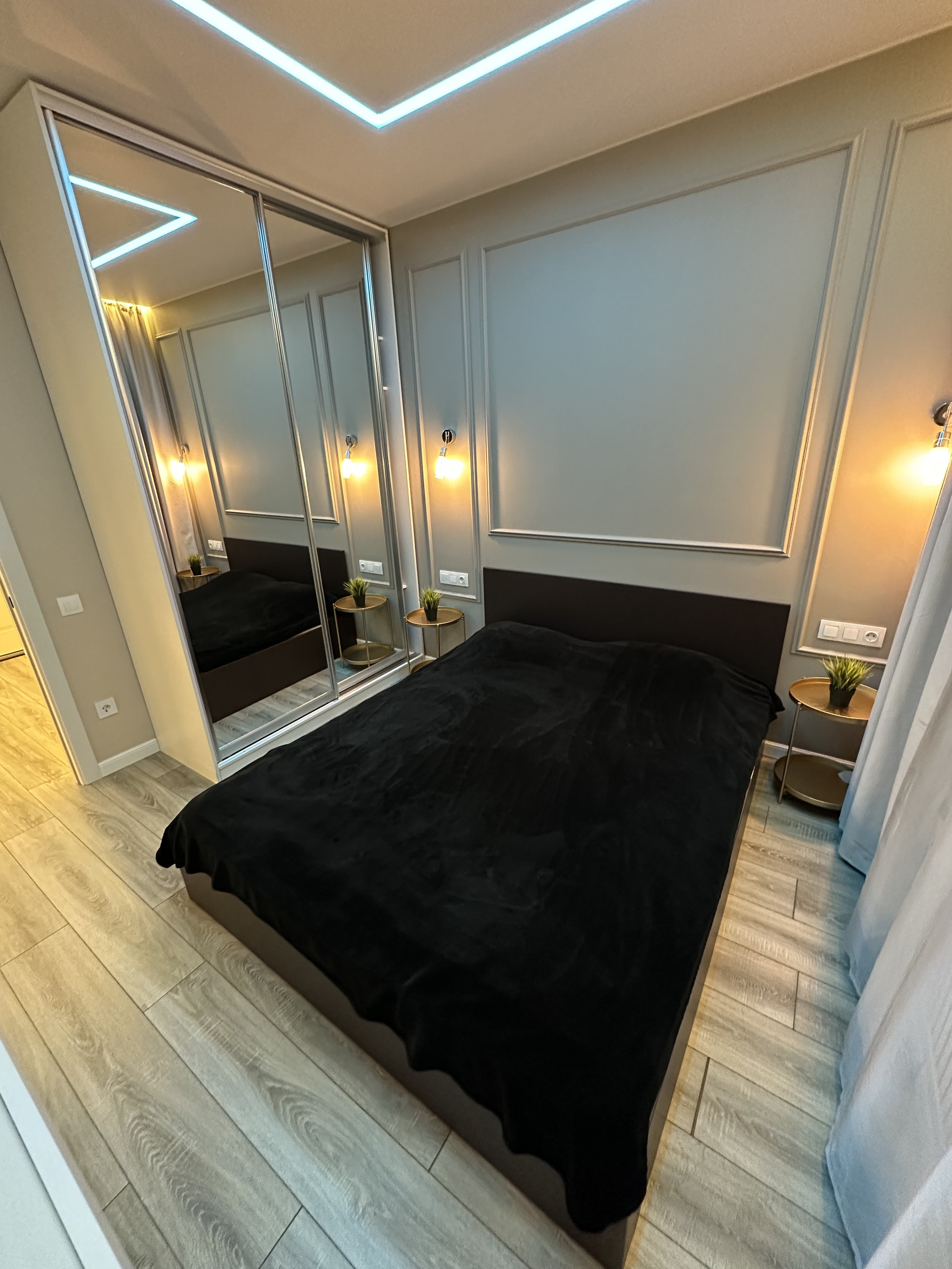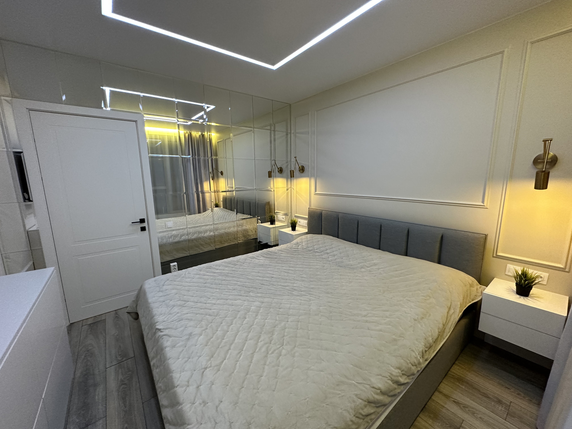В первой спальне есть шкаф-купе для одежды с зеркалами. Стена второй спальни декорирована фацетными зеркалами, в комнате также размещены закрытые стеллажи для хранения вещей.