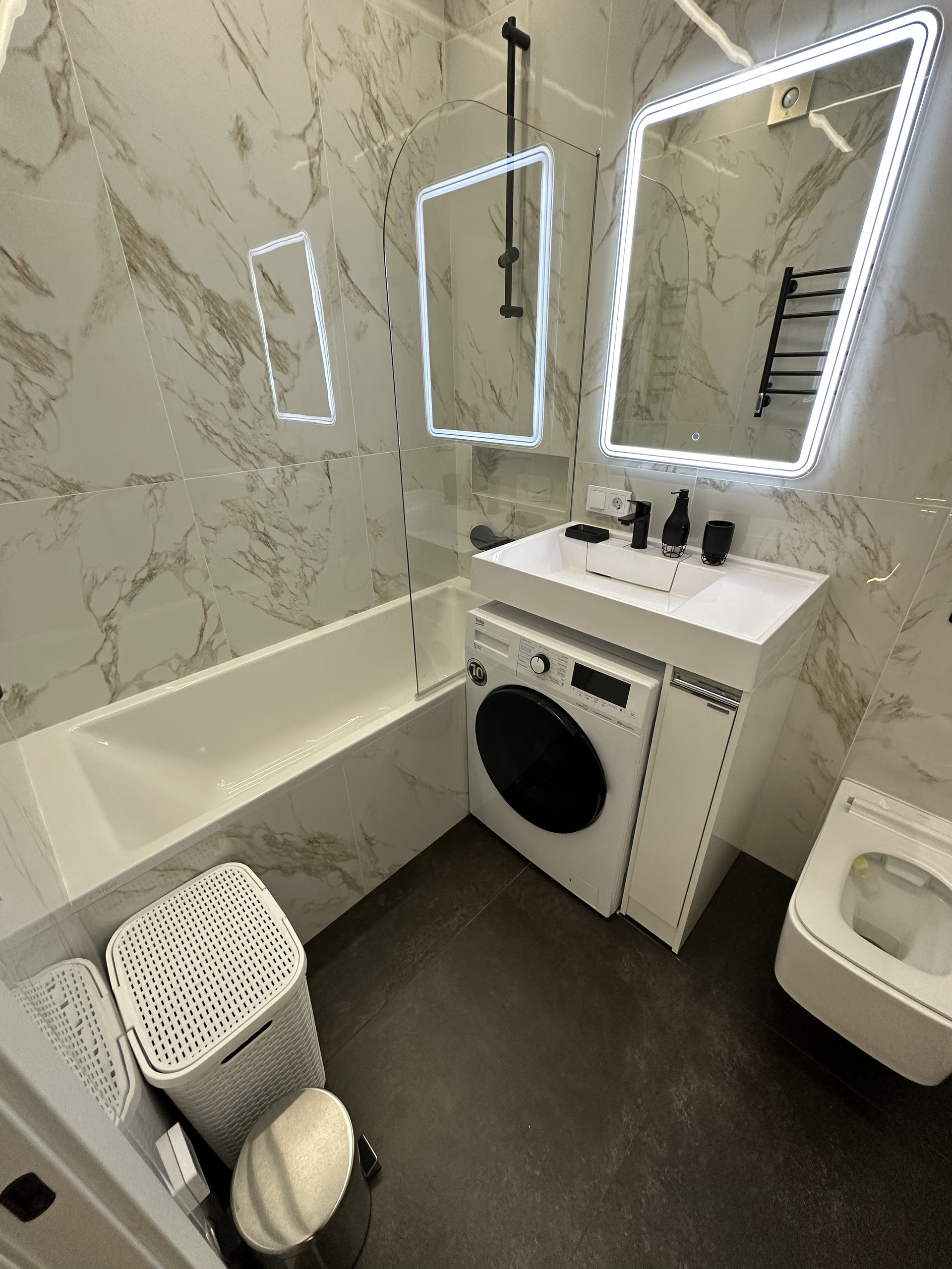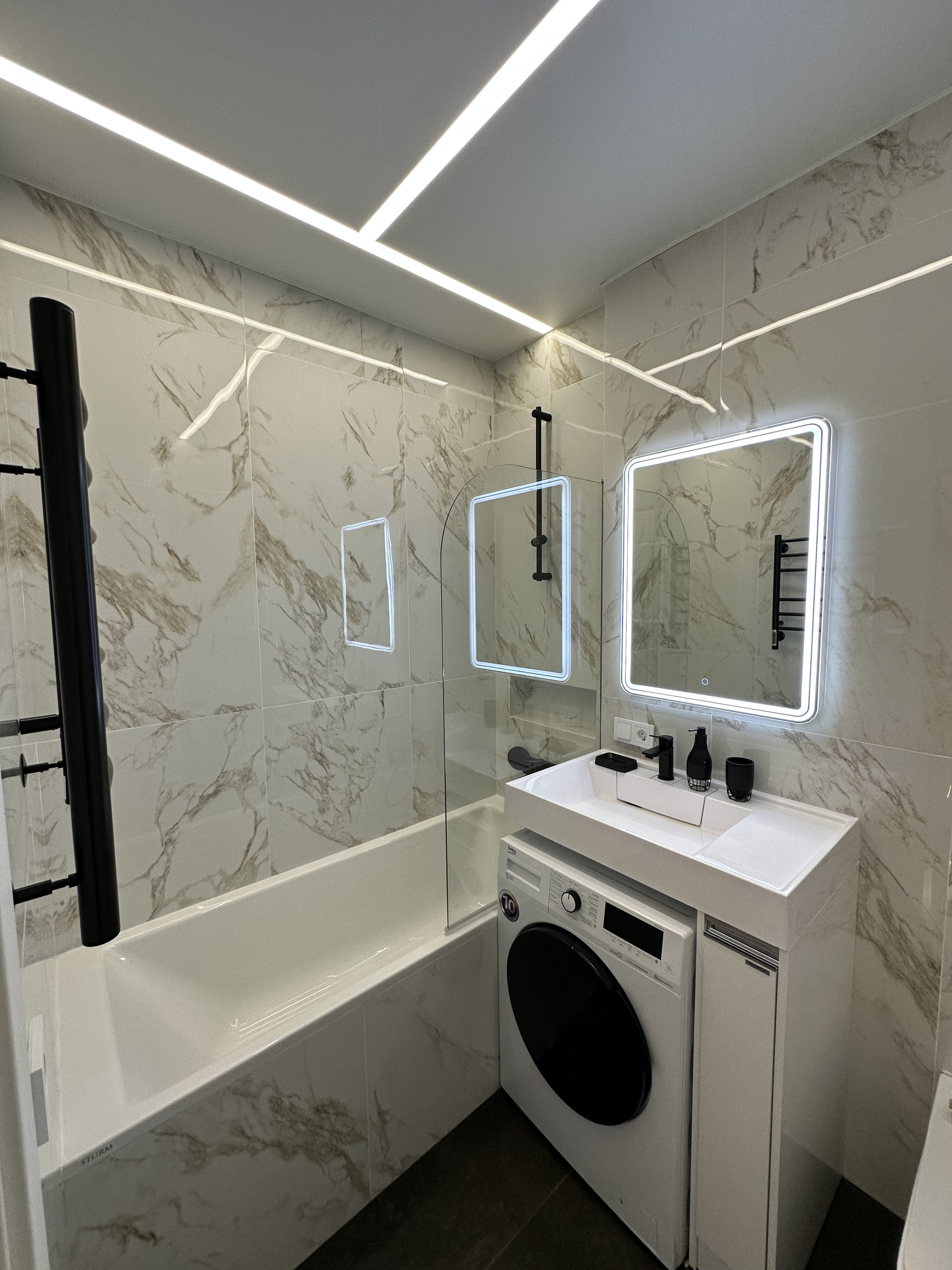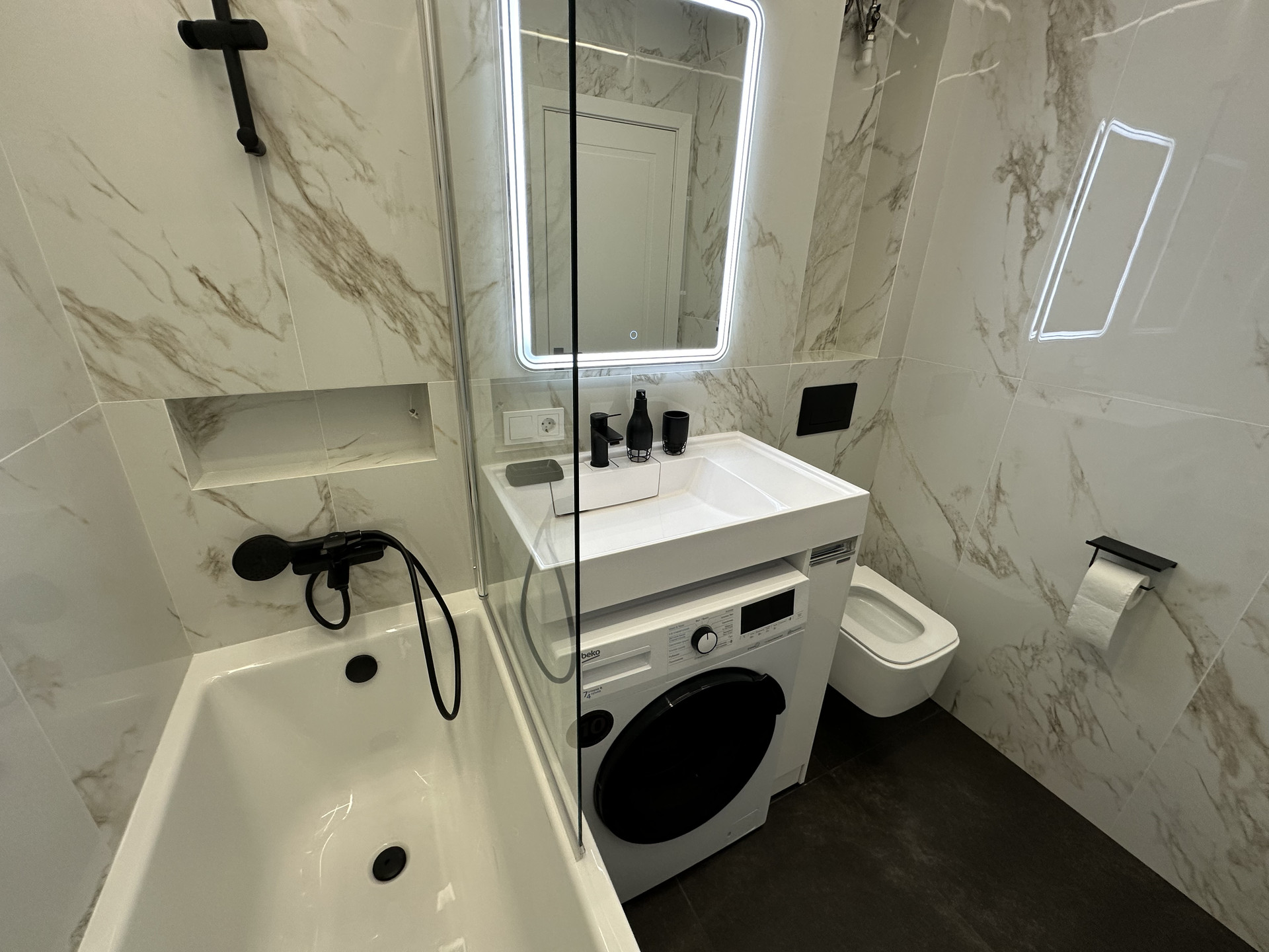 Основной с/у совмещенный, площадью 3,7 кв.м. с ванной, стиральной машиной, установленной под раковиной, и различными видами подсветок.