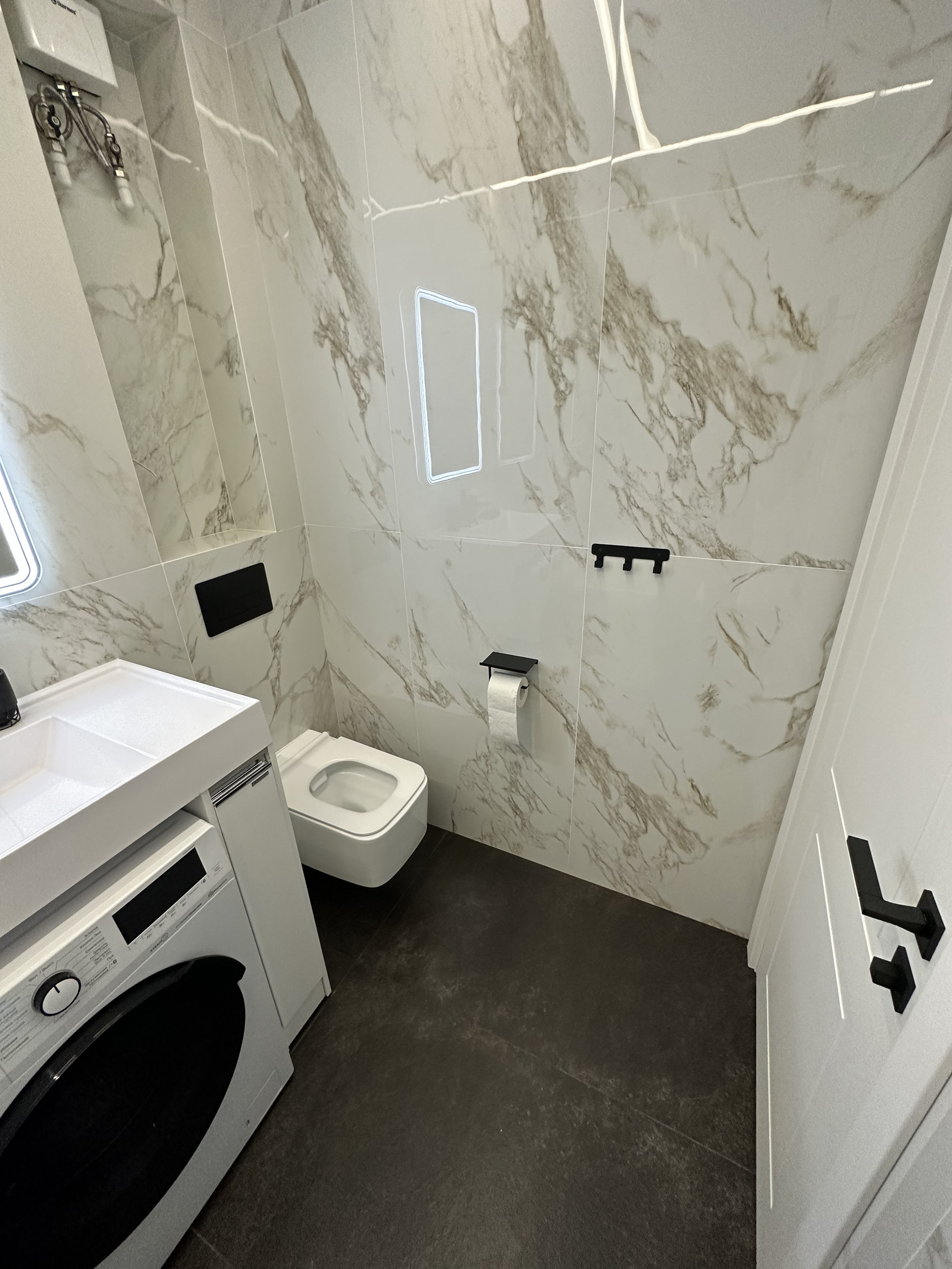 В квартире 2 санузла. Основной с/у совмещенный, площадью 3,7 кв.м. с ванной, стиральной машиной, установленной под раковиной, и различными видами подсветок. Гостевой с/у, площадью 1 кв.м., с умывальником и нишами для размещения предметов интерьера/гигиены. Оба с/у с инсталляцией.