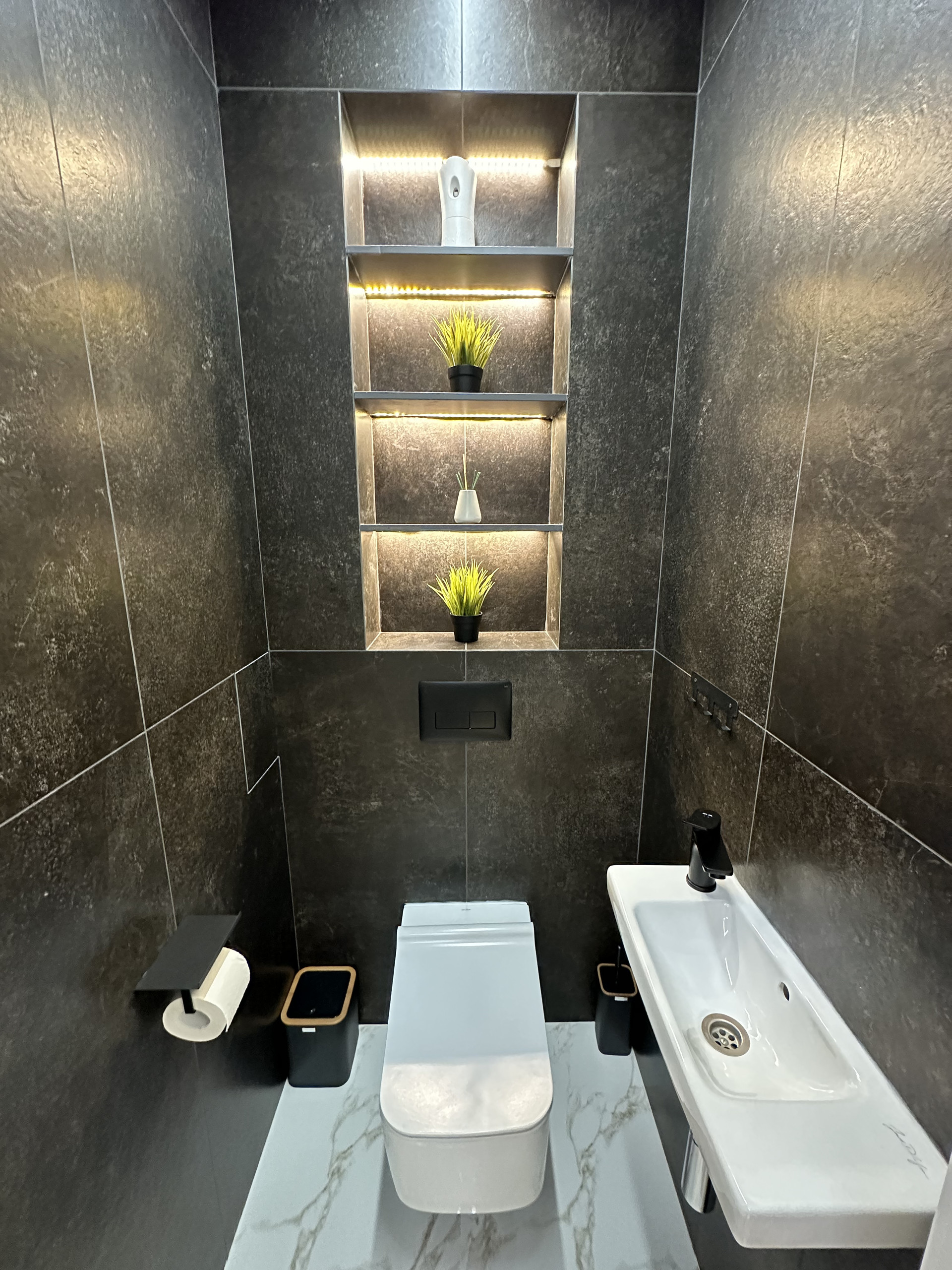 Гостевой с/у, площадью 1 кв.м., с умывальником и нишами для размещения предметов интерьера/гигиены. Оба с/у с инсталляцией.