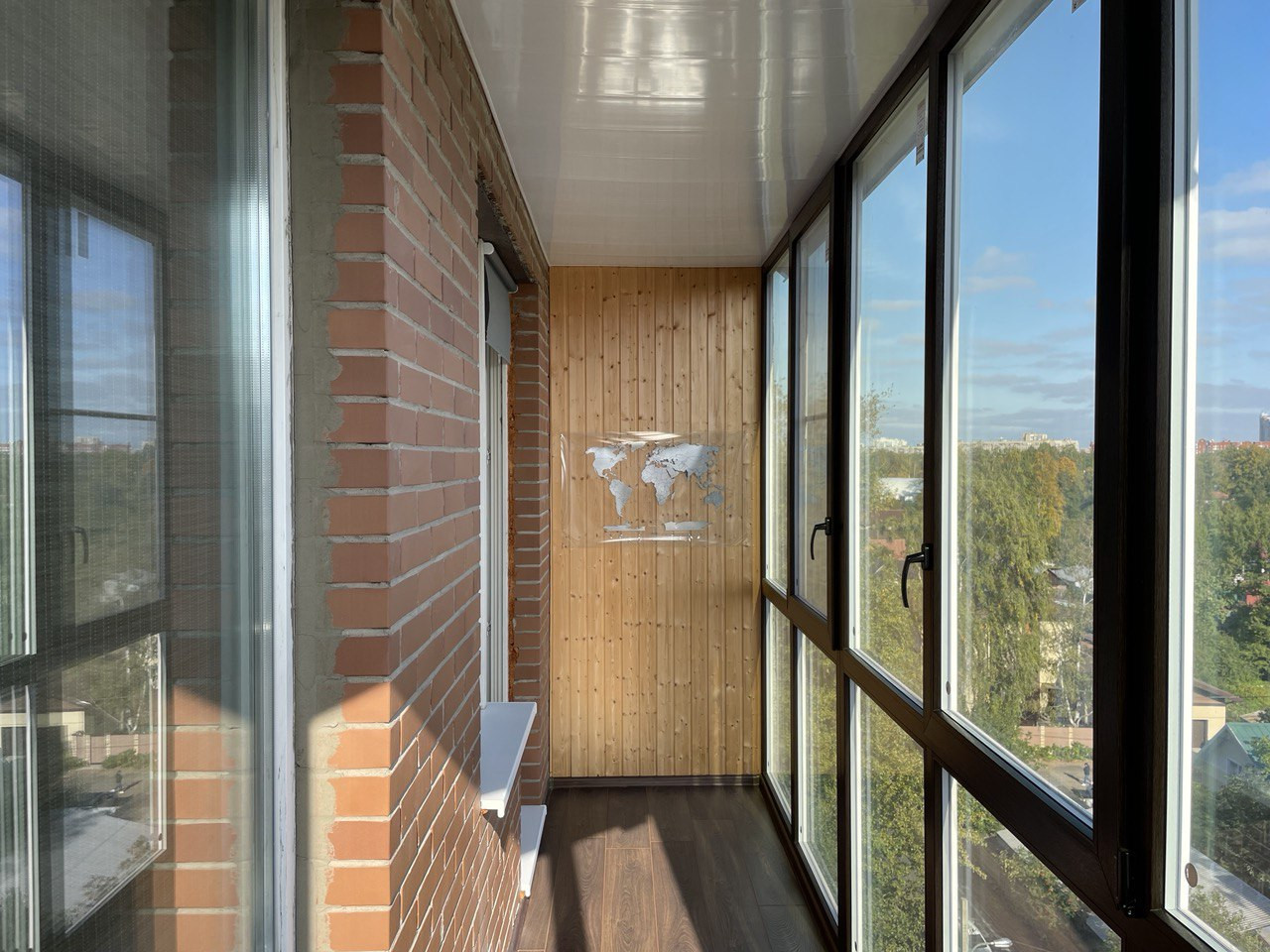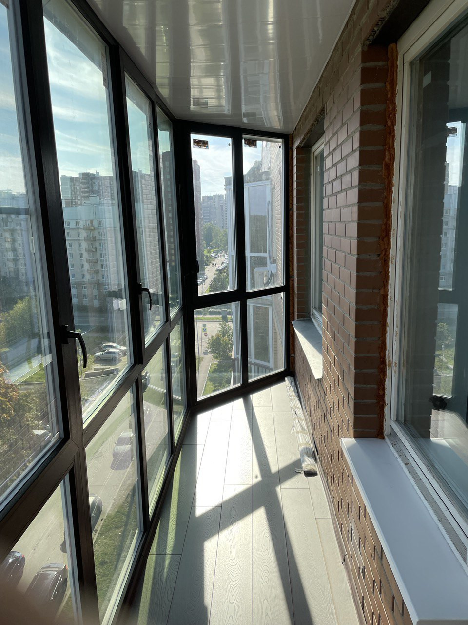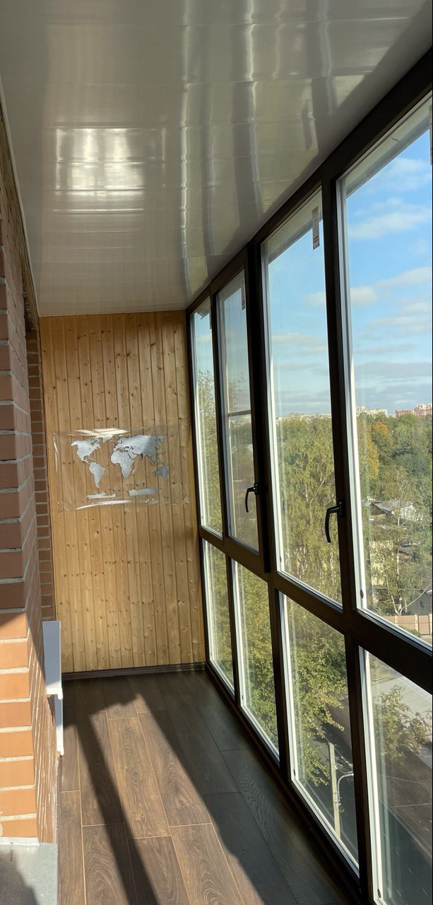 Застекленный балкон 5,6 кв.м.. Премиум профиль с двойным атермальным стеклопакетом, на полу ламинат.