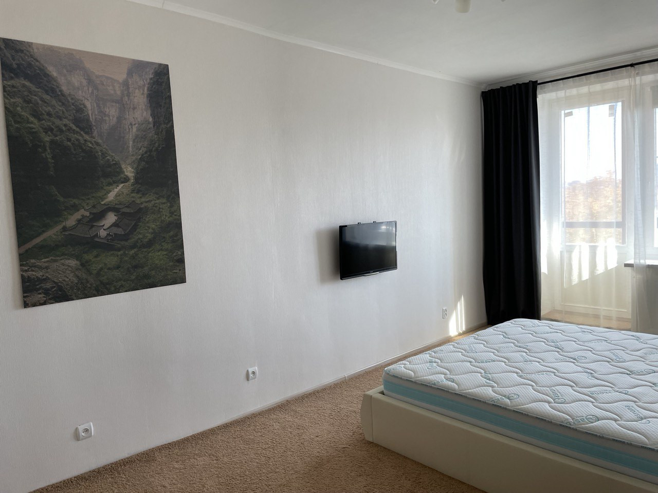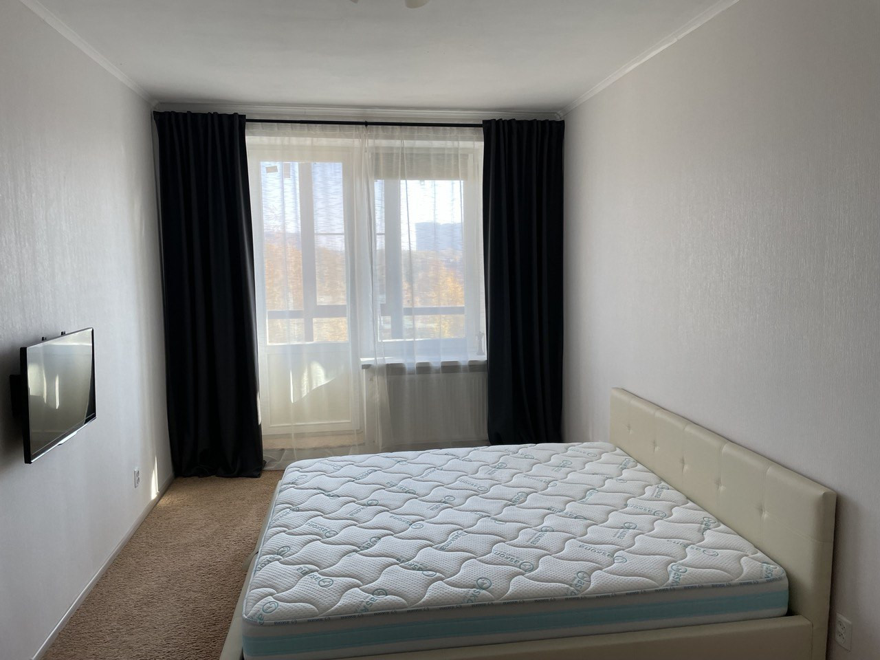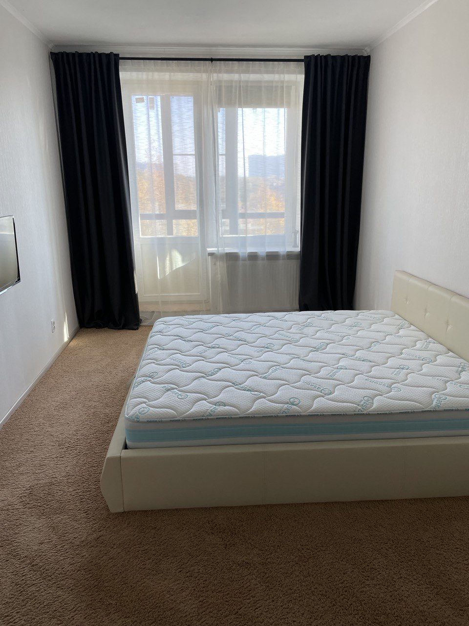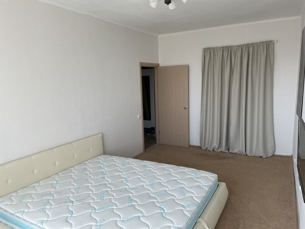 В большой спальне постелен качественный ковролин. Кровать king size 200x200 с большим отделением для хранения вещей, комфортный премиум матрас Ascona, телевизор.