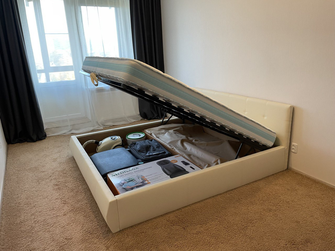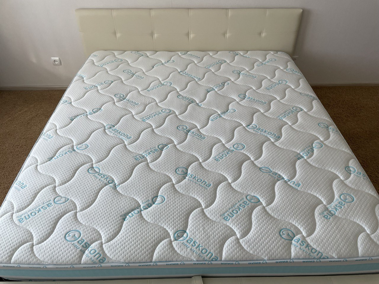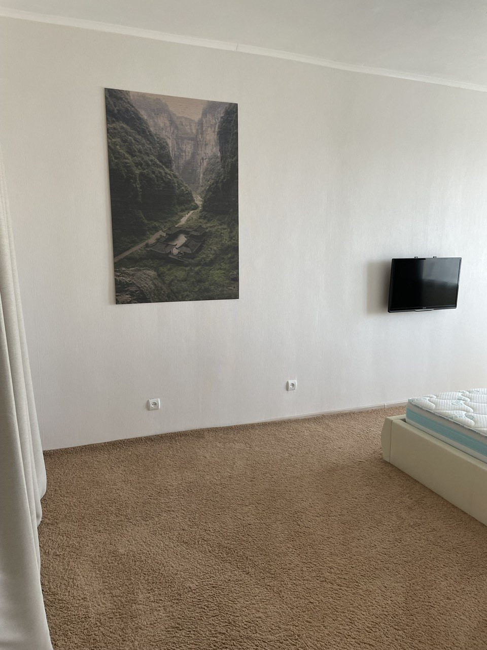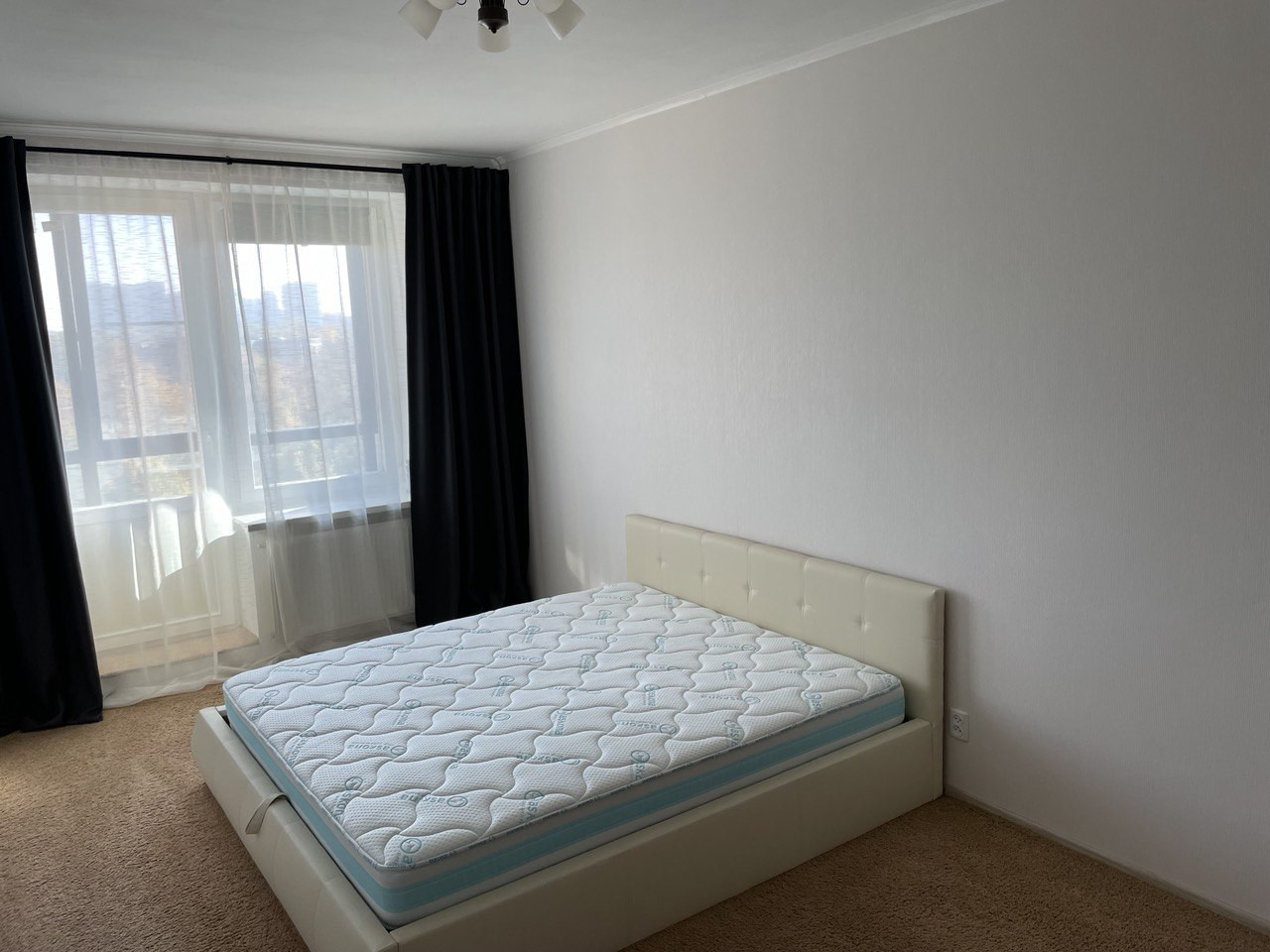 В большой спальне постелен качественный ковролин. Кровать king size 200x200 с большим отделением для хранения вещей, комфортный премиум матрас Ascona, телевизор.