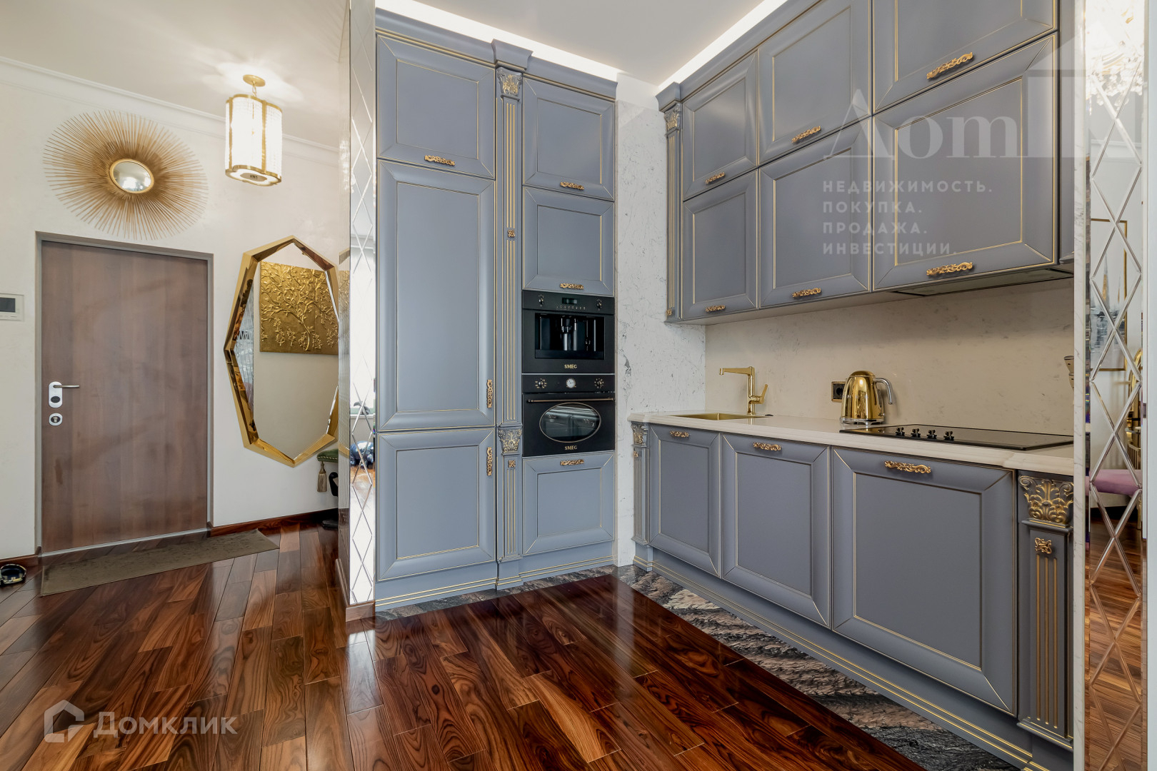 Начиная от высочайшего качества итальянского мрамора Чиполлино Ондулато, развертка Бабочка; венецианской штукатурки с вкраплением серебра; столешниц, обрамления зеркал и подоконников из итальянского мрамора; пола из массива палисандра; дизайнерских люстр и подвесных светильников EICHHOLTZ и Asfour Crystal; ручек SWAROVSKI(Италия)и заканчивая великолепным пуфиком Gucci и дубовой стремяночкой в гардеробной, которые прекрасно вписываются в интерьер.