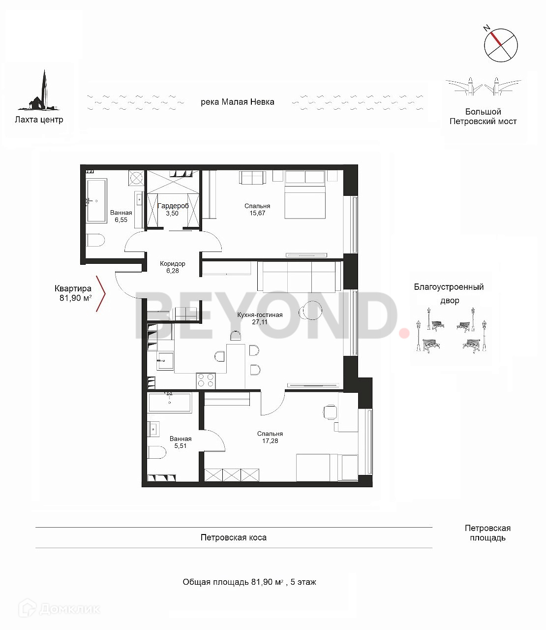 2-комнатная квартира, 81.9 м2, этаж 5 / 8, на продажу в Санкт-Петербурге, Петровская коса, 1к1
