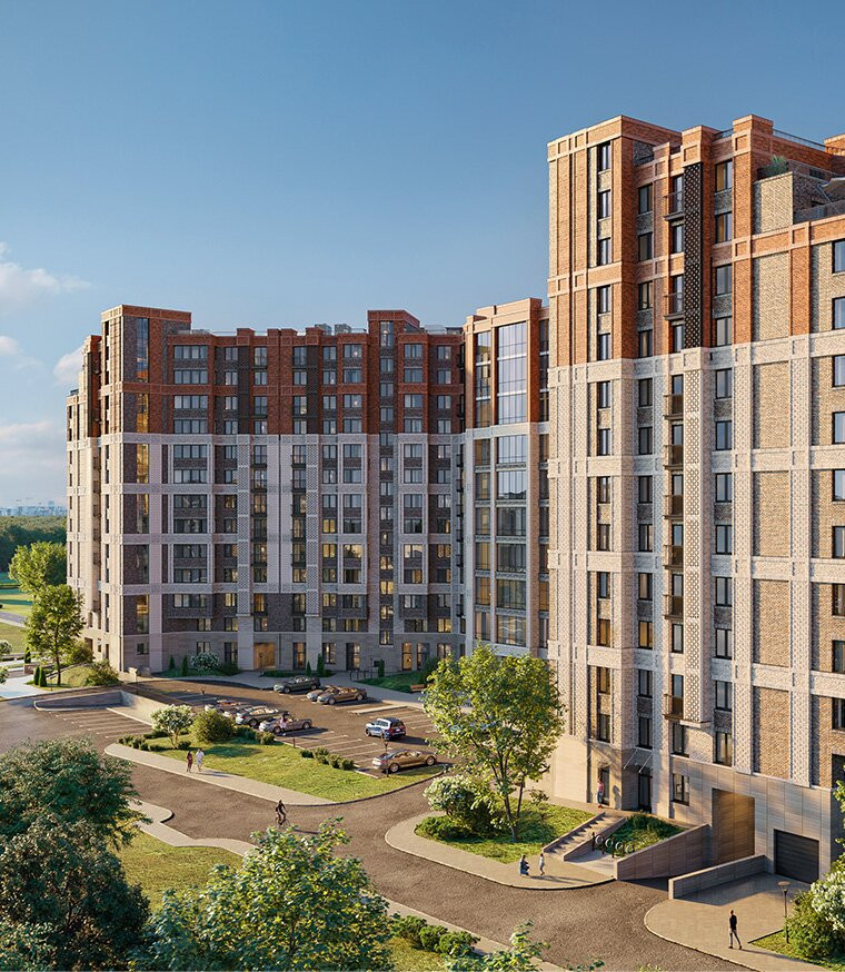 Придомовая территория благоустроена: выложена тротуарная плитка, разбиты газоны и цветники, посажены деревья, выполнен ландшафтный дизайн с применением геопластики. Во дворе оборудованные детские площадки из дерева, спортивные площадки и воркаут зоны, для занятия игровыми видами спорта обустроен стадион. На первых этажах запроектированы коммерческие помещения. Для автовладельцев предусмотрен подземный паркинг, в который можно спуститься на лифте.