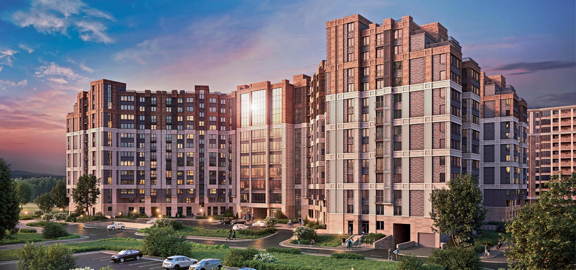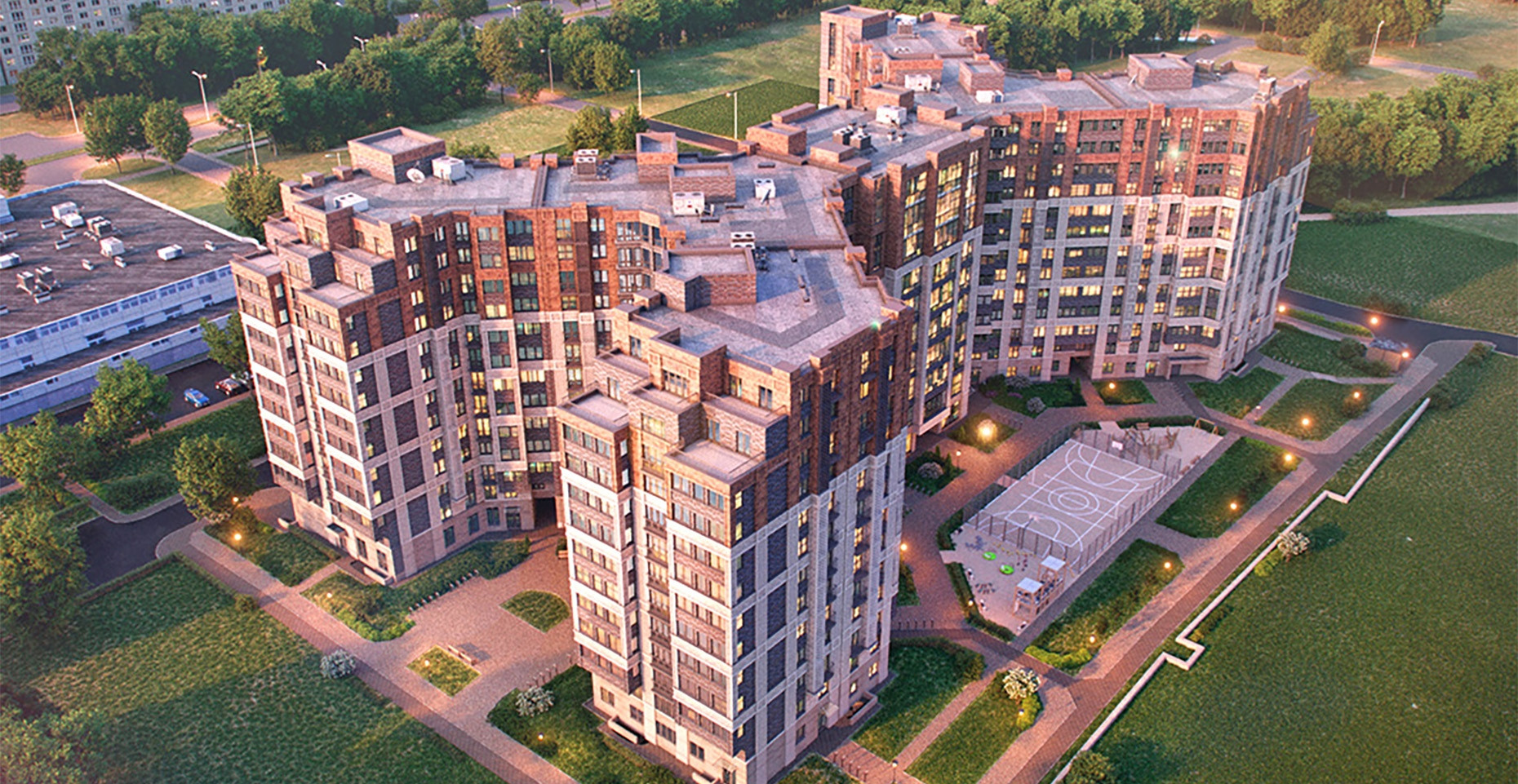 Придомовая территория благоустроена: выложена тротуарная плитка, разбиты газоны и цветники, посажены деревья, выполнен ландшафтный дизайн с применением геопластики. Во дворе оборудованные детские площадки из дерева, спортивные площадки и воркаут зоны, для занятия игровыми видами спорта обустроен стадион. На первых этажах запроектированы коммерческие помещения. Для автовладельцев предусмотрен подземный паркинг, в который можно спуститься на лифте.
