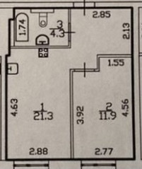 Общая площадь 37,7 кв.м, спальня 11,9 кв.м., просторная кухня гостиная 21,3 кв.м,