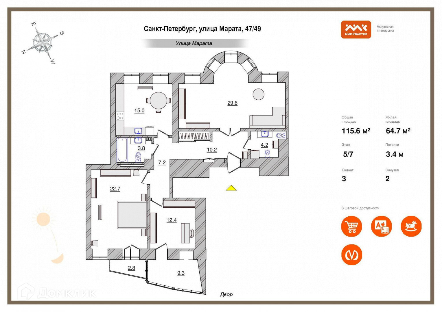 3-комнатная квартира, 115.6 м2, этаж 5 / 7, на продажу в Санкт-Петербурге, улица Марата, 47-49