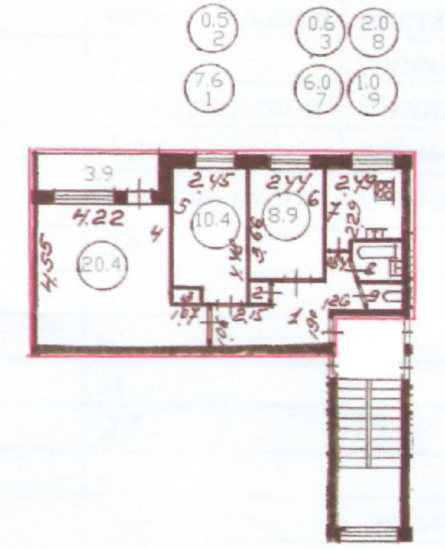 Комнаты площадью 20,4+10,4+8,9 кв.м. изолированные, в большой комнате есть лоджия. Кухня 6 кв.м. Окна выходят в зеленый двор.