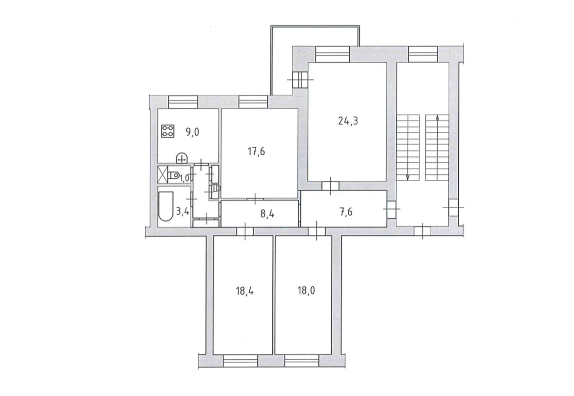 Удачная планировка- квартира двухсторонняя, четыре изолированные просторные комнаты 24,5+18+18+18м.кв., большая прихожая 16м.кв. и кухня 9м.кв., есть балкон. Квартира расположена на 5 этаже (без лифта). Высота потолка 3,0 метра. Квартира очень светлая и теплая.