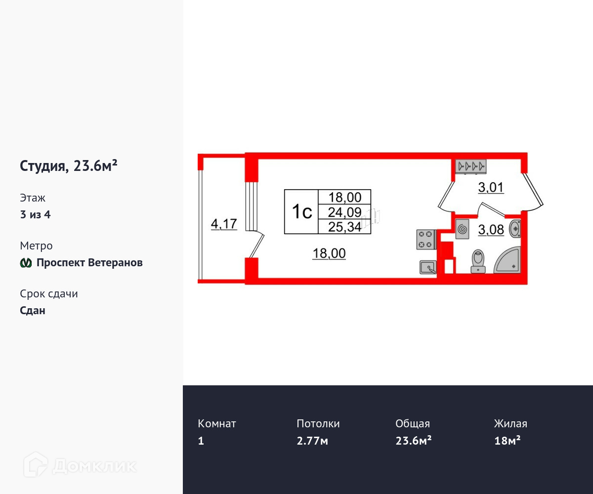 Общая площадь 23.6 м2