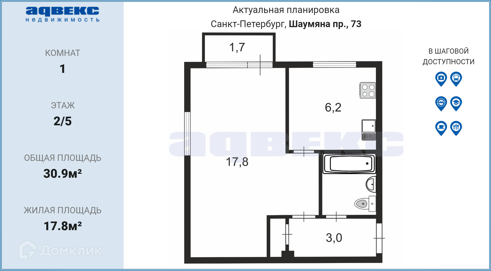 1-комнатная квартира, 30.9 м2, этаж 2 / 5, на продажу в Санкт-Петербурге, проспект Шаумяна, 73