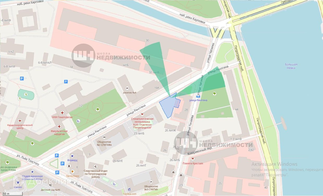 До центра города на автомобиле путь через Троицкий мост займет около 15 минут. В 10 минутах пешком — станция метро Петроградская. В 8 км — выезд на ЗСД. Квартира продается без отделки, что позволит воплотить самые современные интерьерные решения. Звоните, с удовольствием отвечу на Ваши вопросы и организую просмотр в удобное для Вас время. Профессиональная  ответственность ООО «Школа недвижимости» застрахована на 5 млн.руб.