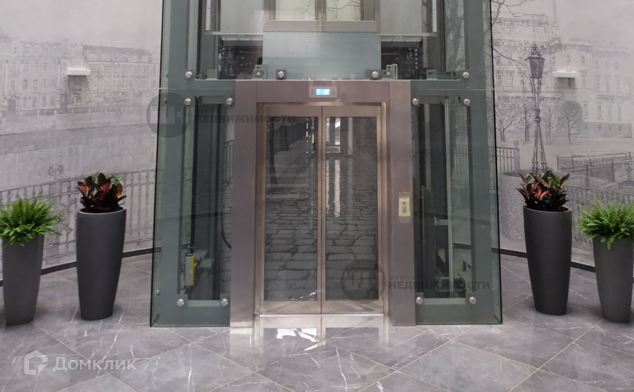 Входная группа дома имеет атриум с естественным освещением, которое обеспечивается светопрозрачным стеклянным куполом. На стенах атриума художественная роспись исторических видов Санкт-Петербурга, выполненная вручную мастерами по декоративной штукатурке. Изюминкой дома является шикарный стеклянный панорамный лифт.