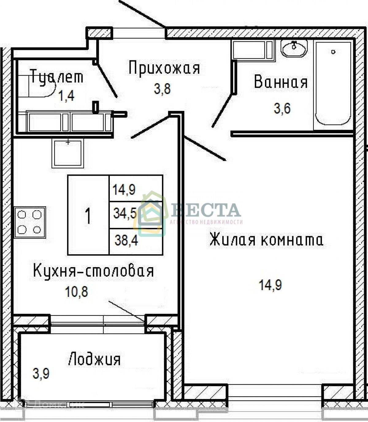 Общая площадь 34.5 м2