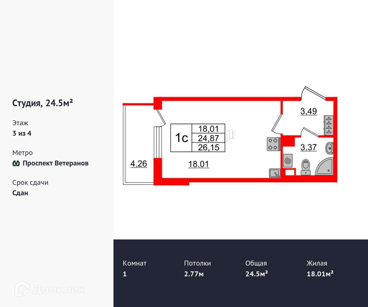 Общая площадь 24.5 м2