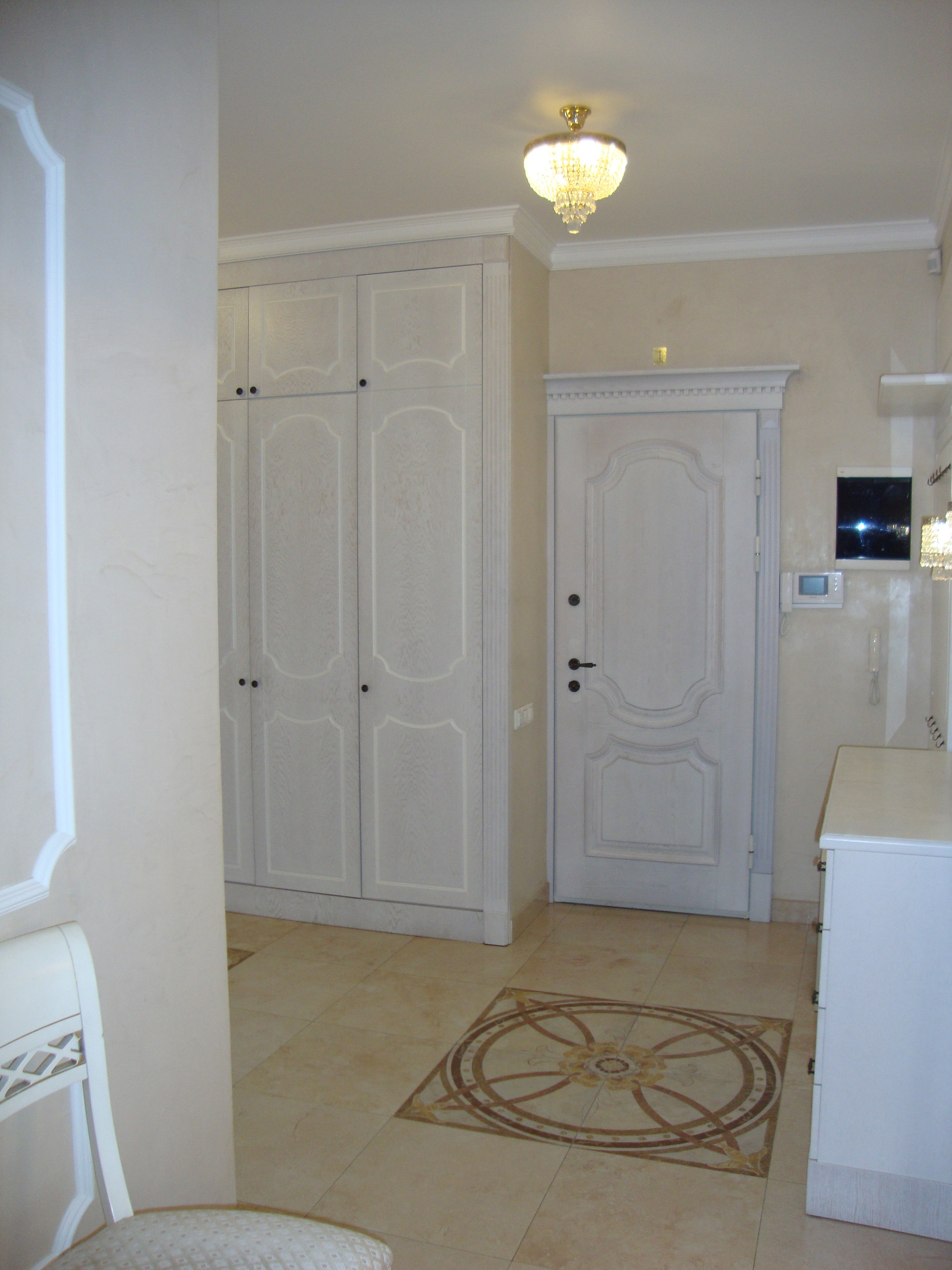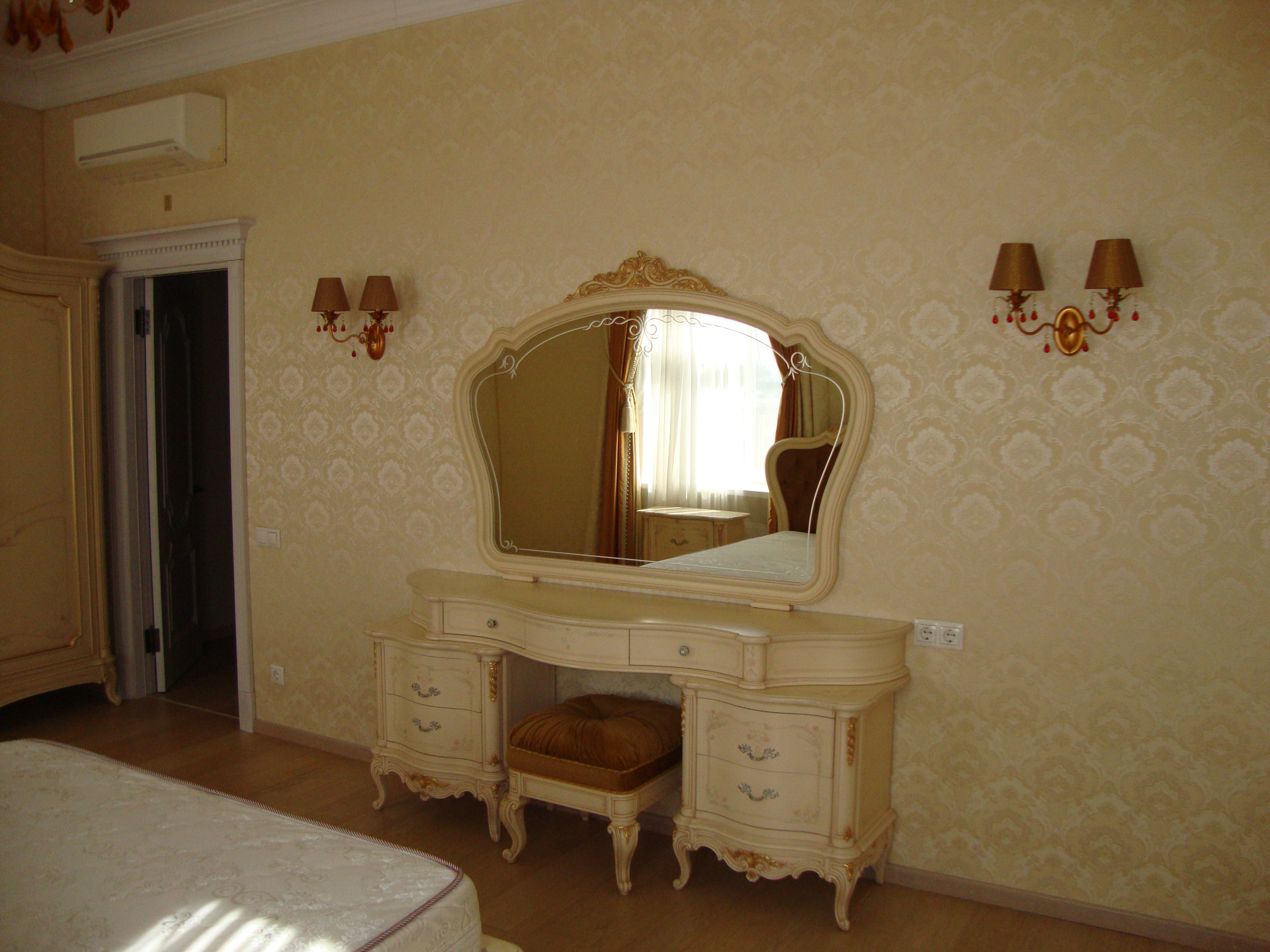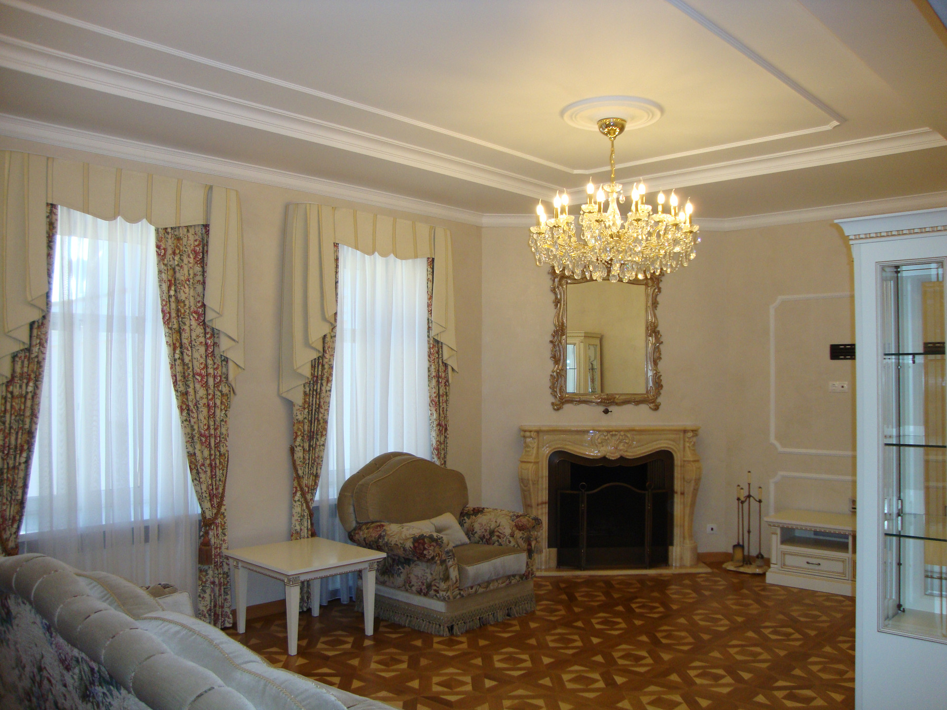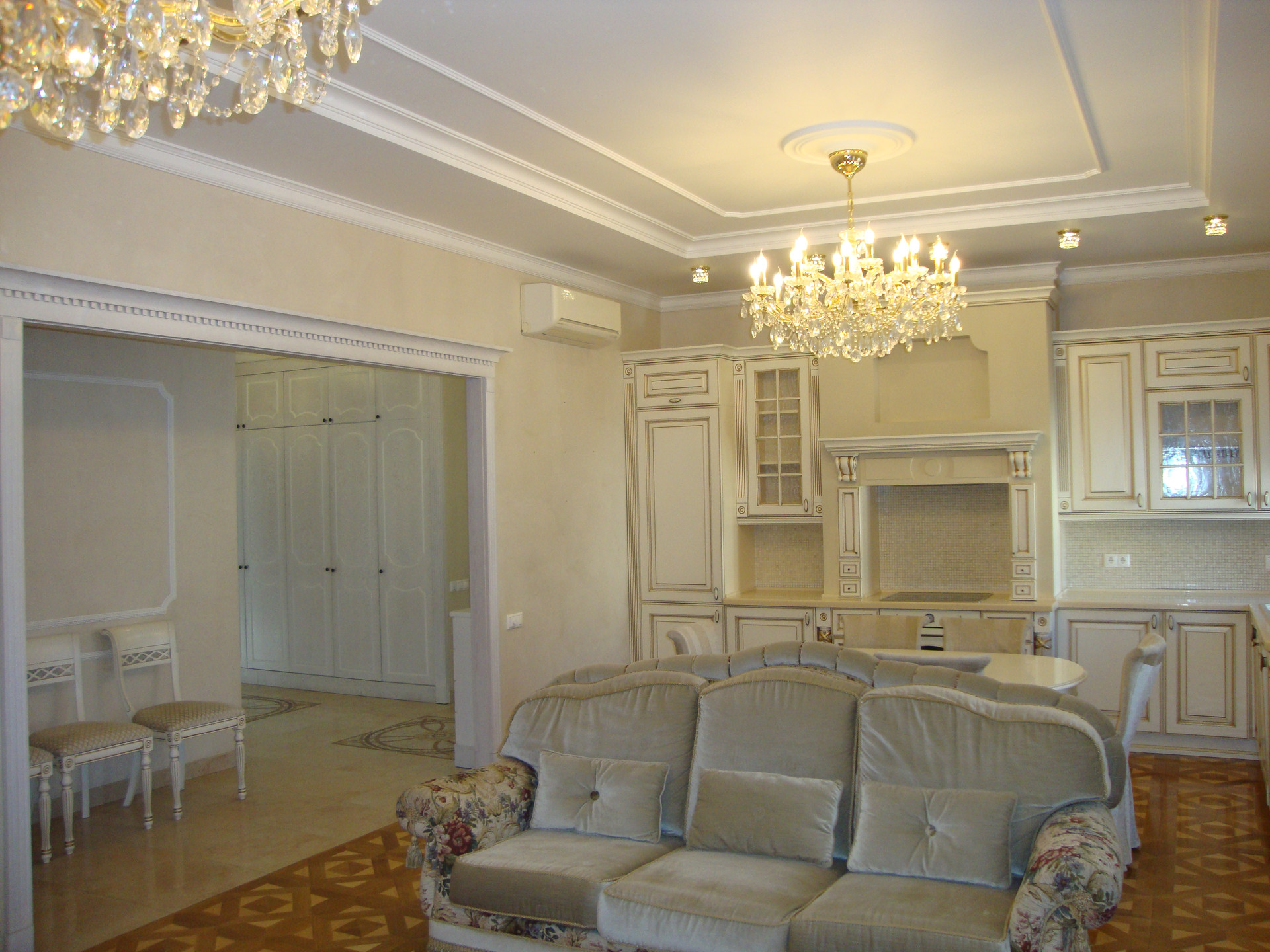 В квартире выполнен качественный, дизайнерский ремонт в классическом стиле. Камин: выполнен из натурального оникса, с аксессуарами из латуни с элементами оникса. Над Камином зеркало из массива (Италия). Стены: Кухня-Гостиная и Холл на 1 и 2 этажах классическая венецианская штукатурка, натуральные текстильные обои производства Италия, и обои других европейских производителей. Пол: в гостиной Мозаичный наборный паркет, в остальных комнатах паркетная доска, в Холле на 1 этаже и СУ плитка (Испания), установлены тёплые полы. Сантехника и аксессуары Итальянские: сантехника премиум-класса «Migliore», «Franke Old England». Ограждение в душевой на 1 этаже производство Германия. Установлен мощный угольный очиститель воды. Есть водонагреватель (на случай отключения горячего водоснабжения). В Холле на 2 этаже и в основной Спальне сделаны полки с обрамлением из натурального гипса. На лестнице фреска, выполненная Петербургской художницей, обрамлена фреска гипсом. Лестница и двери выполнены полностью из массива на частном предприятии Петербурга, аксессуары к дверям: Европа. Гардеробная: шведские гардеробные системы «Elfa». Высокие фигурные потолки. Люстры в Кухне-Гостиной Австрия, в других комнатах европейских производителей. Кухня производство «Верона». Совместное производство Италия-Россия: фасады Италия, сборка российская. Вся остальная мебель: Италия «Valderamobili». В спальне с ручной росписью. В Холле мебель (комод, вешалка, встроенный шкаф) то же производство, что и двери. Квартира двухсторонняя очень светлая, благодаря большому количеству окон. Подоконники выполнены из искусственного камня. Во всех комнатах установлены кондиционеры «MITSUBISHI».