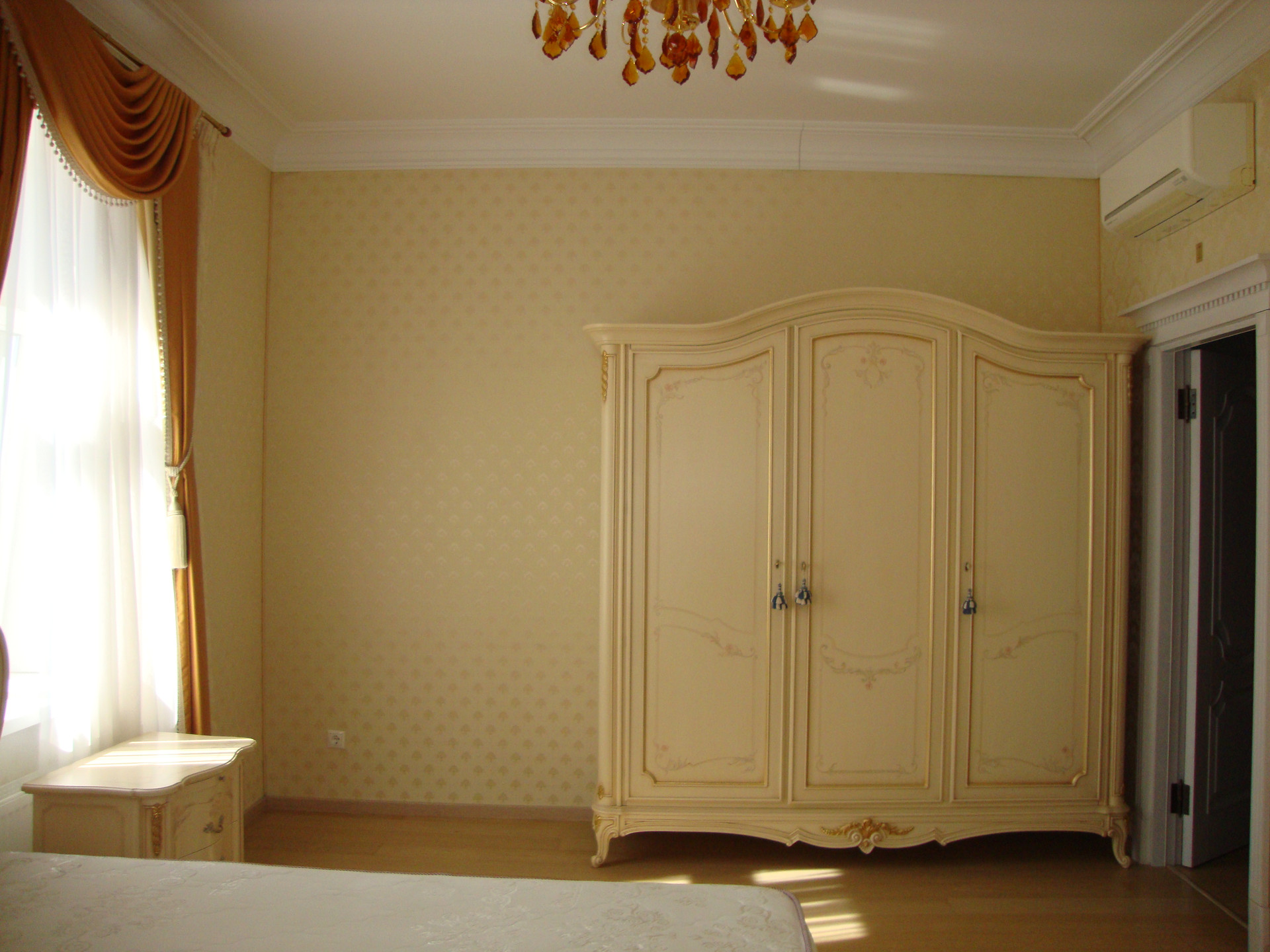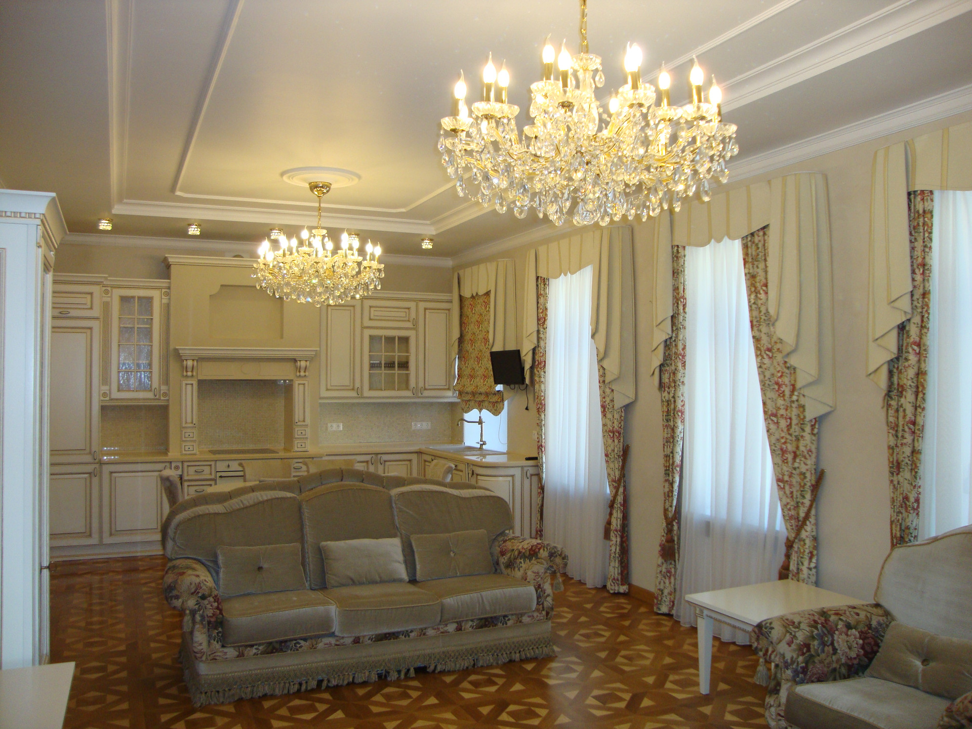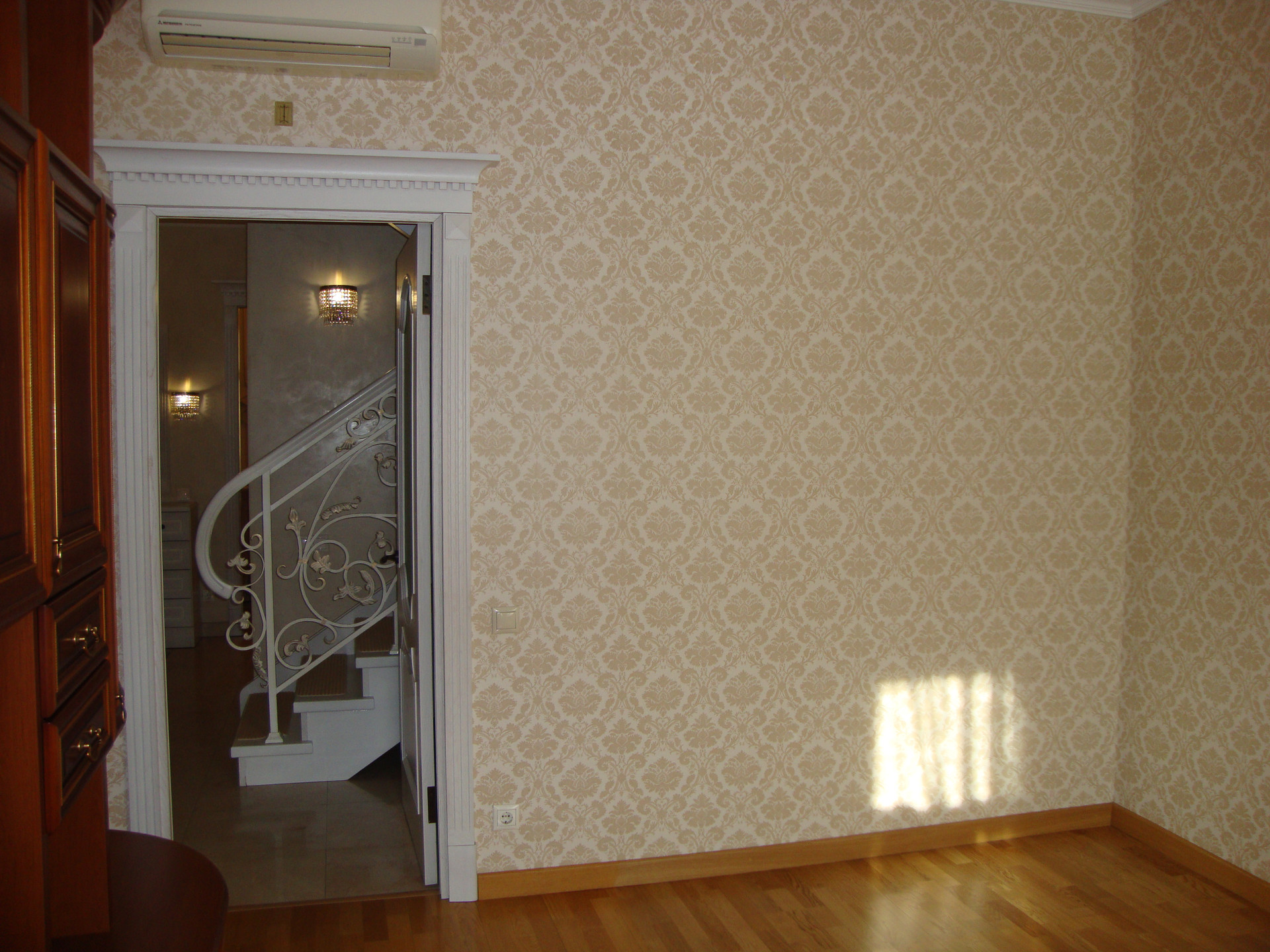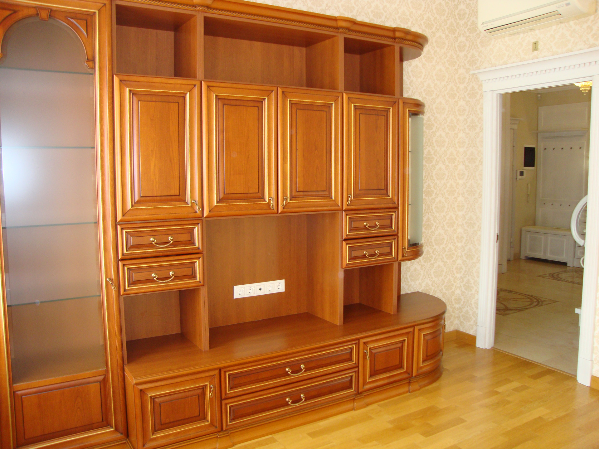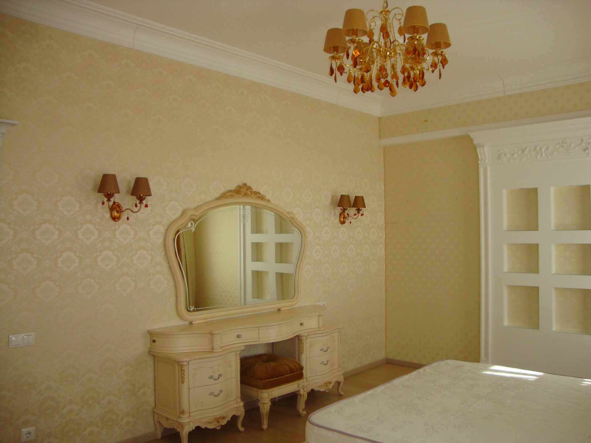 В квартире выполнен качественный, дизайнерский ремонт в классическом стиле. Камин: выполнен из натурального оникса, с аксессуарами из латуни с элементами оникса. Над Камином зеркало из массива (Италия). Стены: Кухня-Гостиная и Холл на 1 и 2 этажах классическая венецианская штукатурка, натуральные текстильные обои производства Италия, и обои других европейских производителей. Пол: в гостиной Мозаичный наборный паркет, в остальных комнатах паркетная доска, в Холле на 1 этаже и СУ плитка (Испания), установлены тёплые полы. Сантехника и аксессуары Итальянские: сантехника премиум-класса «Migliore», «Franke Old England». Ограждение в душевой на 1 этаже производство Германия. Установлен мощный угольный очиститель воды. Есть водонагреватель (на случай отключения горячего водоснабжения). В Холле на 2 этаже и в основной Спальне сделаны полки с обрамлением из натурального гипса. На лестнице фреска, выполненная Петербургской художницей, обрамлена фреска гипсом. Лестница и двери выполнены полностью из массива на частном предприятии Петербурга, аксессуары к дверям: Европа. Гардеробная: шведские гардеробные системы «Elfa». Высокие фигурные потолки. Люстры в Кухне-Гостиной Австрия, в других комнатах европейских производителей. Кухня производство «Верона». Совместное производство Италия-Россия: фасады Италия, сборка российская. Вся остальная мебель: Италия «Valderamobili». В спальне с ручной росписью. В Холле мебель (комод, вешалка, встроенный шкаф) то же производство, что и двери. Квартира двухсторонняя очень светлая, благодаря большому количеству окон. Подоконники выполнены из искусственного камня. Во всех комнатах установлены кондиционеры «MITSUBISHI».