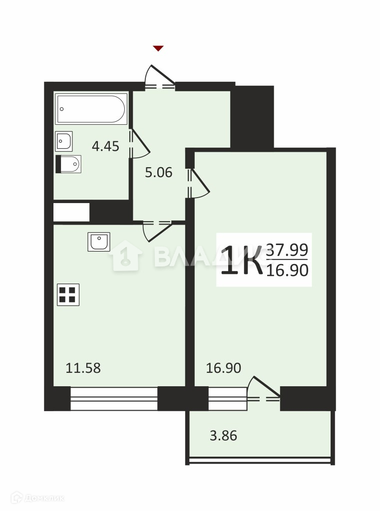 Общая площадь - 38 м.кв.