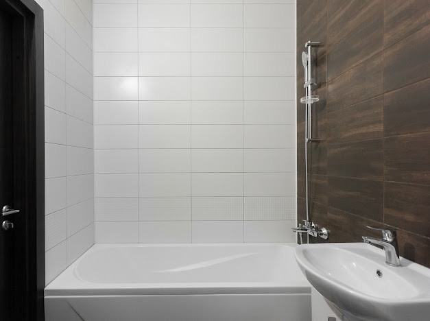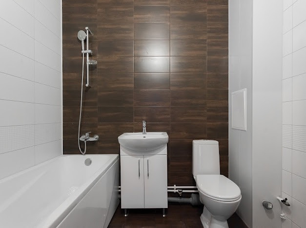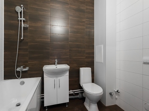 Особенности отделки  теплые полы в ванной комнате, ламинат высокого класса прочности, обои под покраску и несколько коллекций плитки в отделке ванной и санузлов.