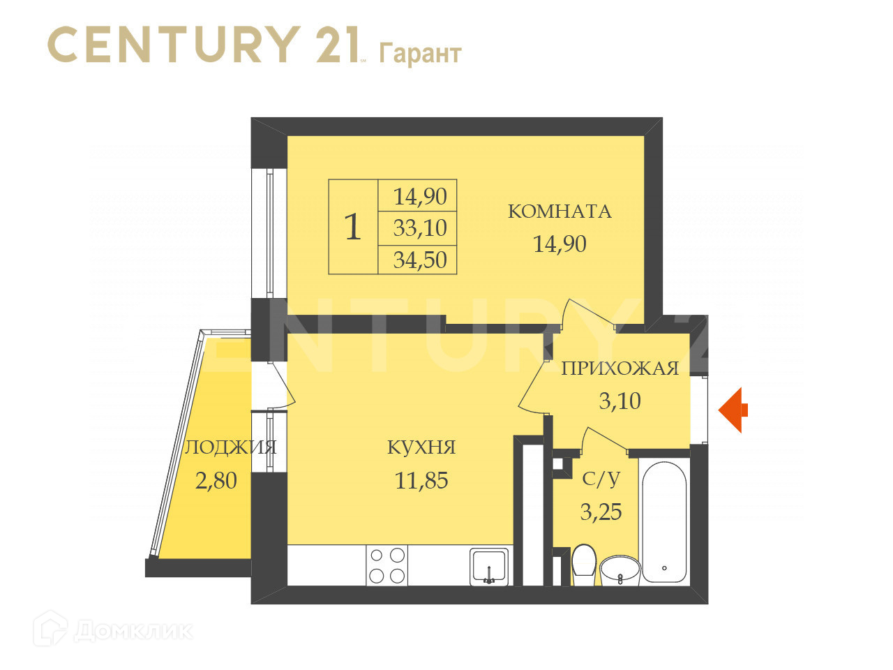 Общая площадь 34.5 м2