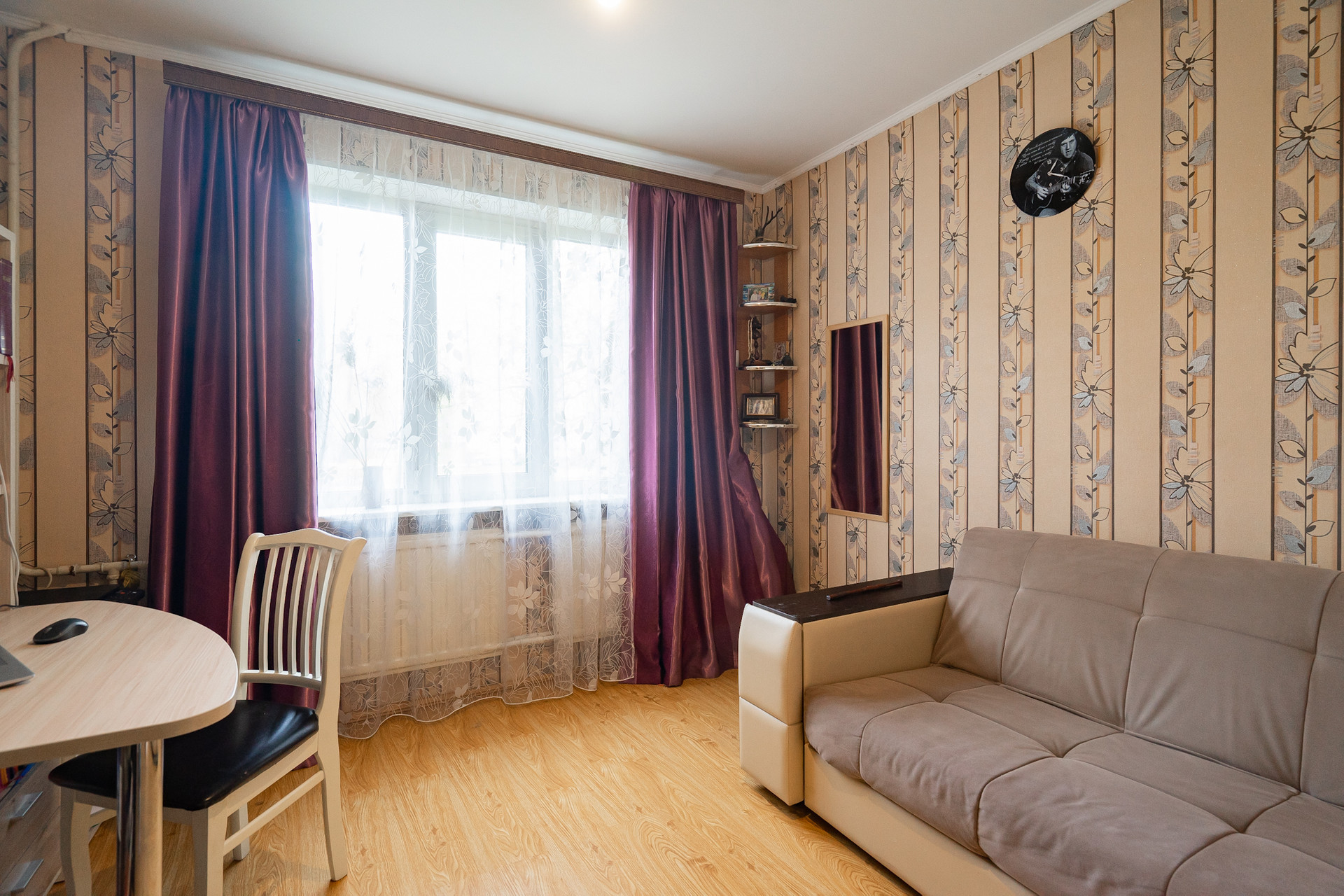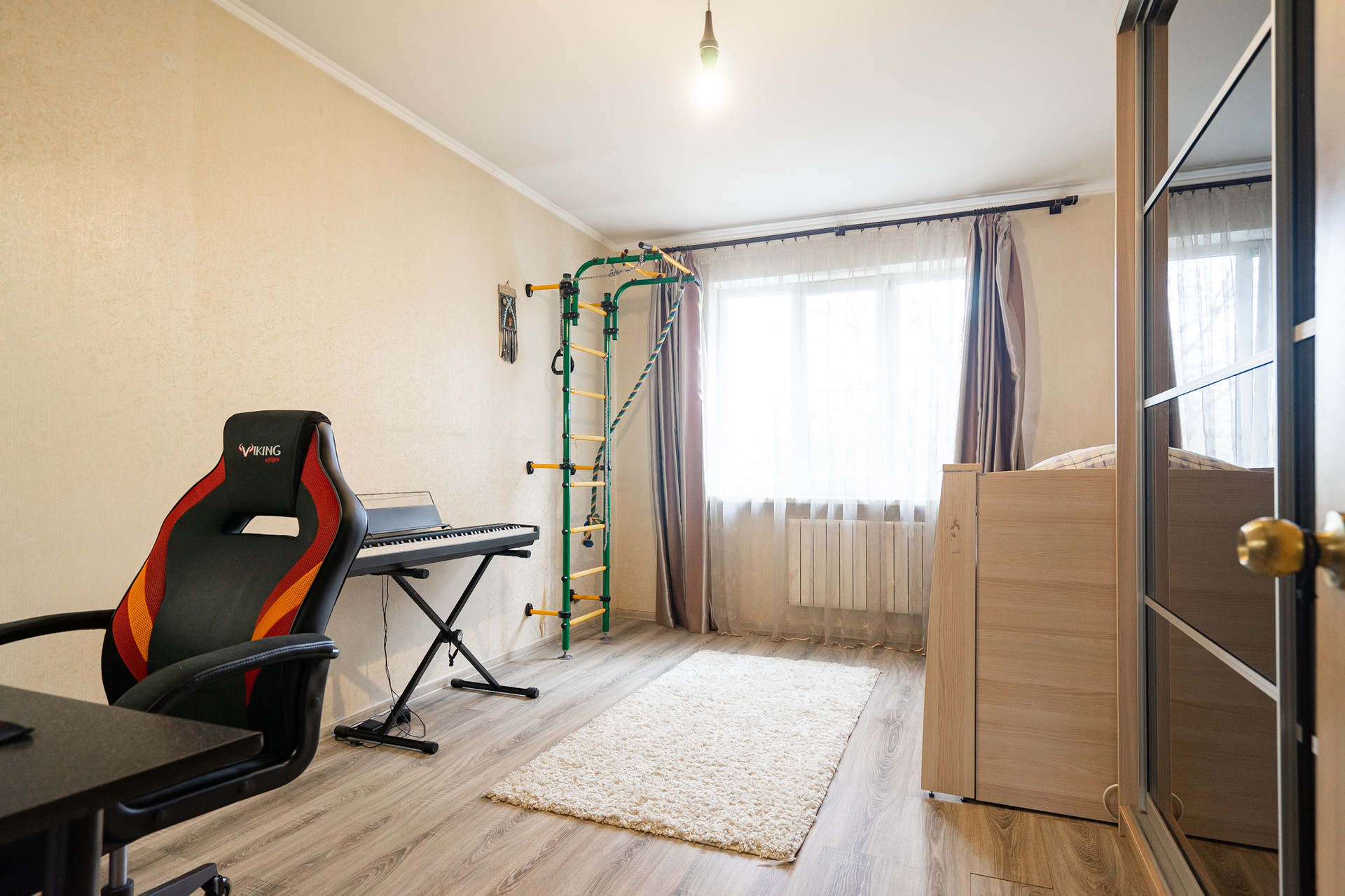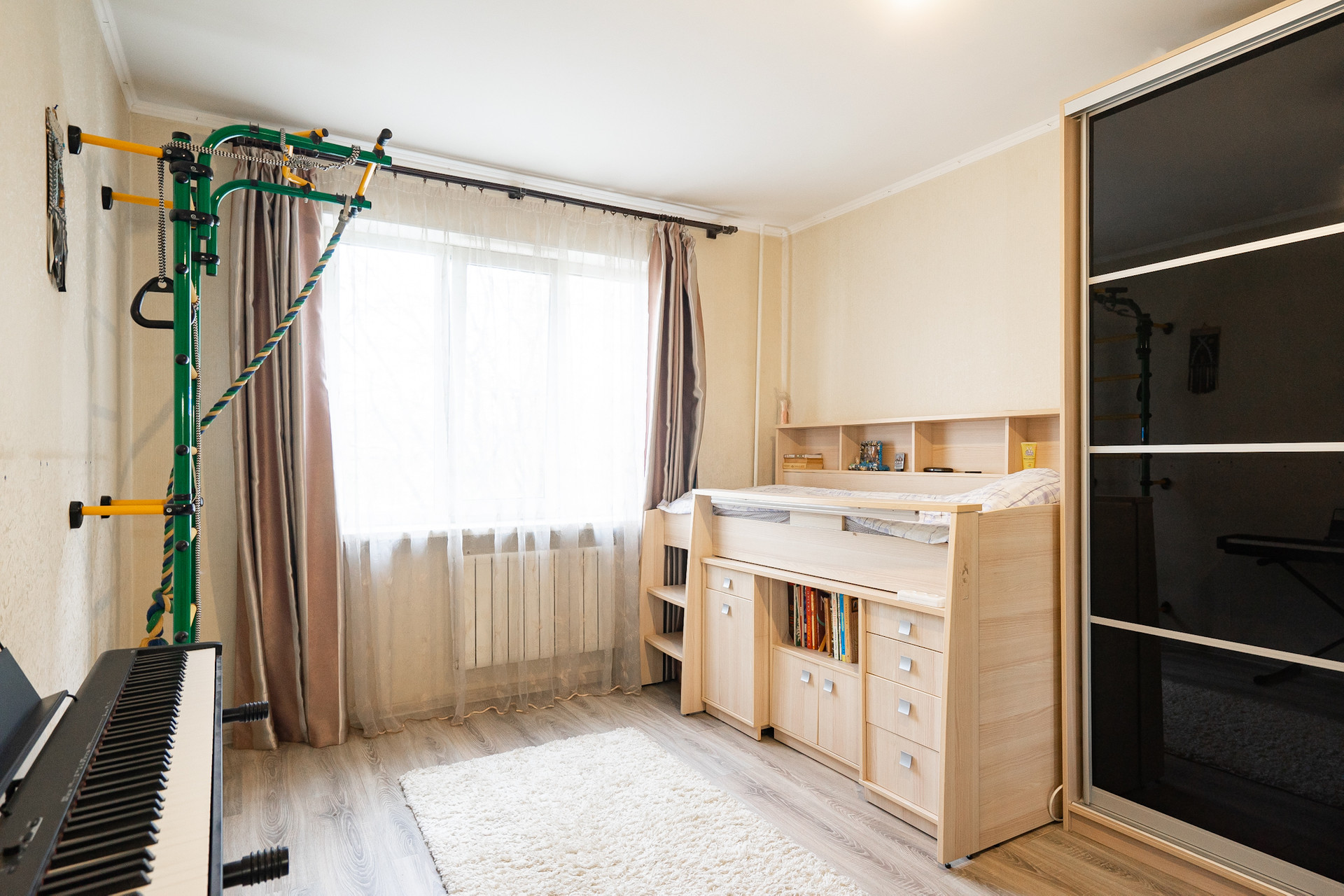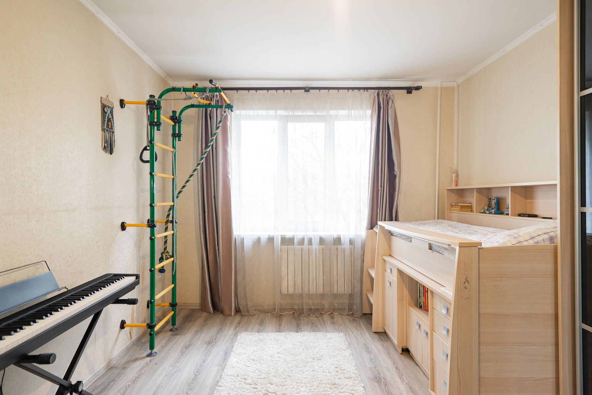Квартира на первом непроблемном этаже. Он высокий, 2 с лишним метра от земли и у окон палисадники, поэтому перед окнами никто не ходит. Пол тёплый.