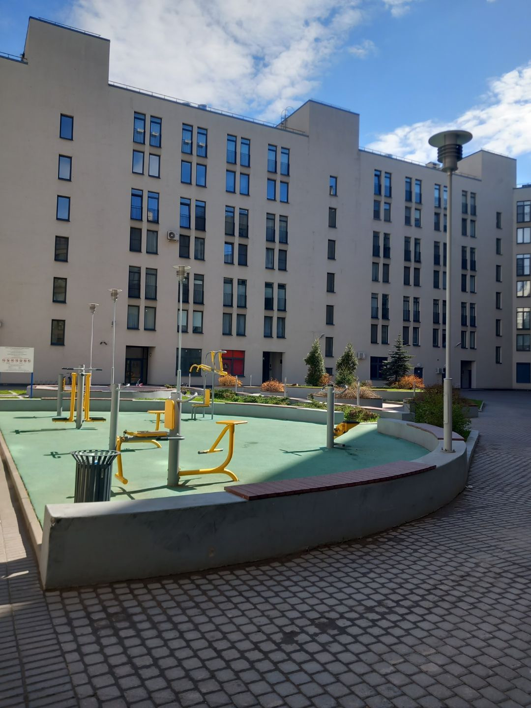 Во дворе нет стоянки машин, а оборудованы детские площадки, посажены ели и можжевельники.