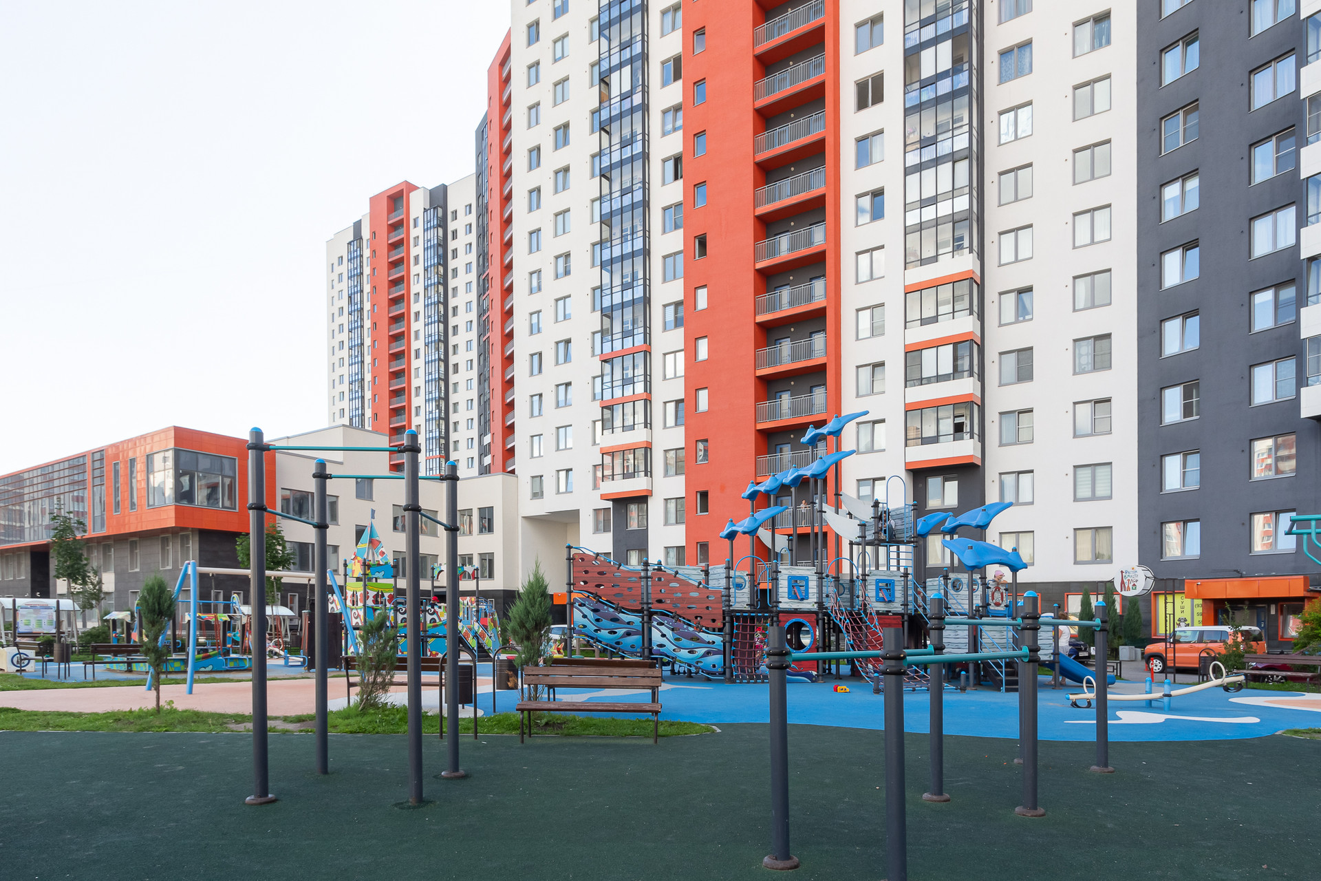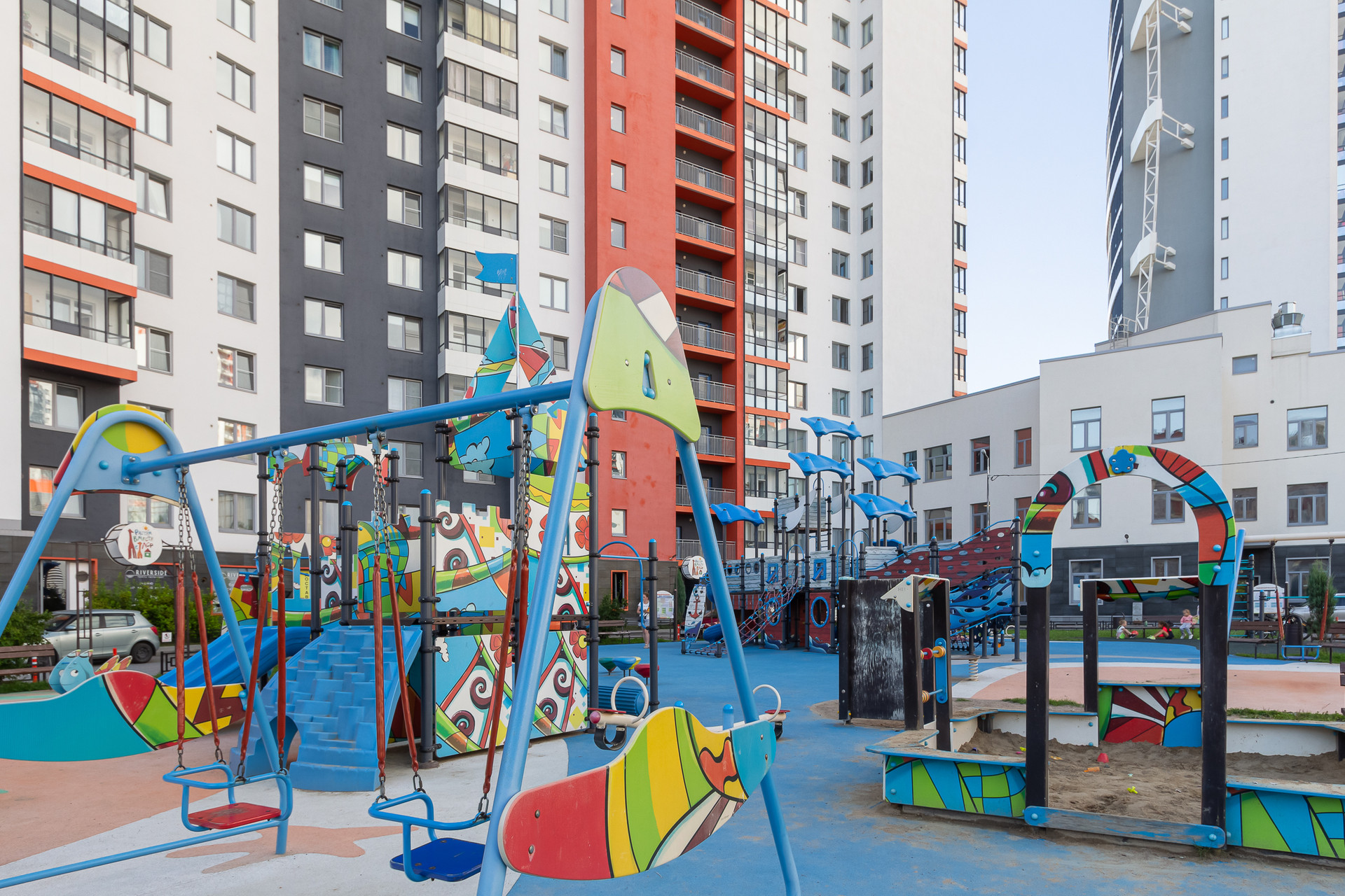 Для маленьких жильцов предусмотрены роскошные современные детские площадки. На территории микрорайона 2 детских сада, 4 школы, танцевальные студии, прямо в доме открывается школа иностранных языков.