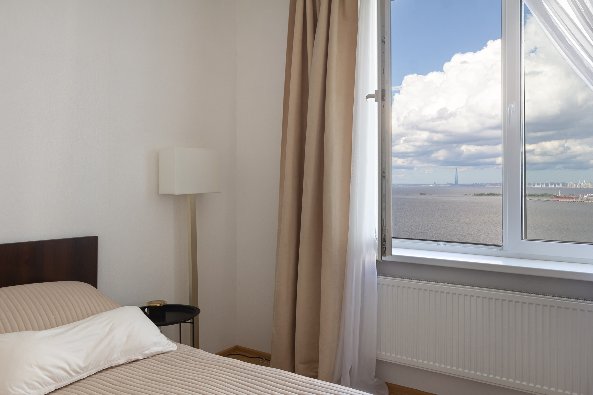 Квартира очень светлая, с функциональной планировкой, в которой прекрасно разделены публичная и приватная зоны. Два балкона, с которых открывается поистине впечатляющий панорамный вид на водную гладь Финского залива, Кронштадт, Лахта Центр.